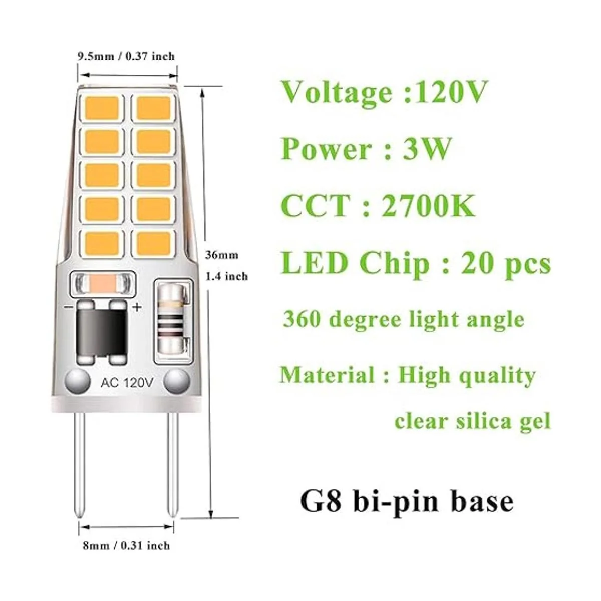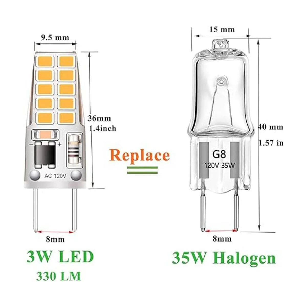 Estas son bombillas LED G8 de 3 W con base G8 de dos pines, la distancia entre dos pines es de 0.315 in