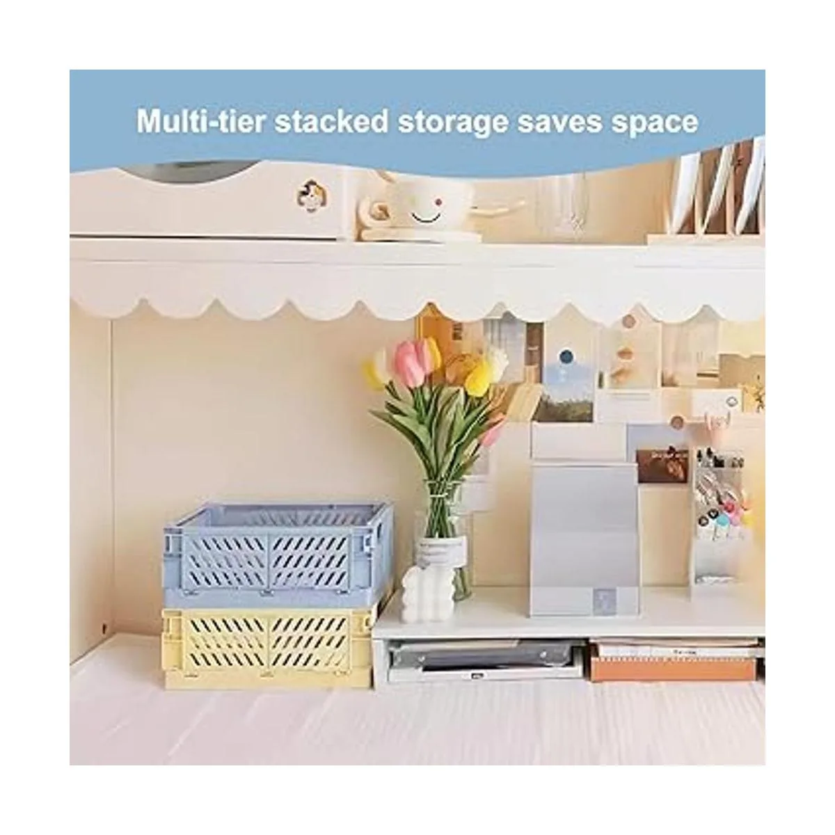 Ampliamente utilizado: las cajas portátiles se apilan verticalmente, se pliegan cuando no están en uso. El tamaño pequeño hace que ocupe muy poco espacio, pero puede crear una encimera limpia y ordenada, incluyendo cajones de oficina, mostradores de cajero, estante de taquillas, tocadores de baño, mesita de noche de dormitorio, etc., se puede colocar perfectamente en cualquier espacio estrecho, para ampliar el espacio de almacenamiento adicional sin ocupar otro espacio útil.