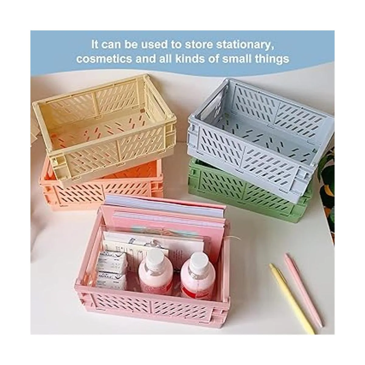 Paquete de 5 jaulas pastel para organizadores de escritorio, mini cestas de plástico para organización de oficina, cajones plegables apilables para el hogar, cocina, dormitorio, baño, oficina 5.9 x 3.8 pulgadas