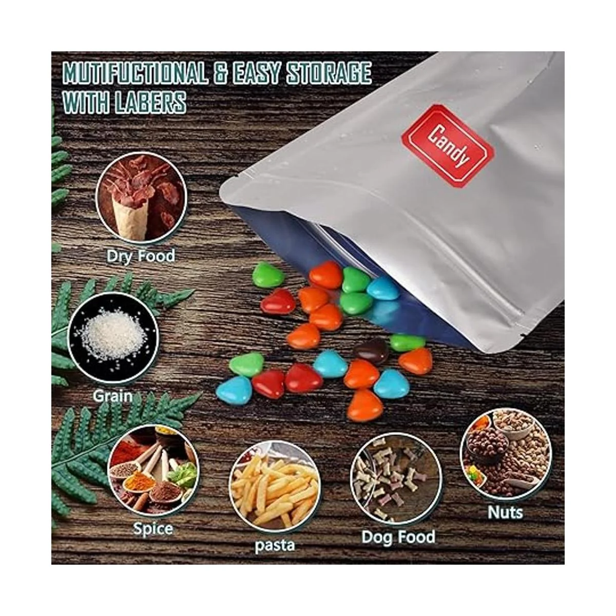 Tamaño y cantidad: hay 50 bolsas de mylar de 9.4 mil un lado de 4.7 mil de 7 x 10 pulgadas de 1/4 galón y 50 etiquetas en un paquete. También ofrecemos otros tamaños de bolsas de embalaje para satisfacer tus diferentes necesidades.