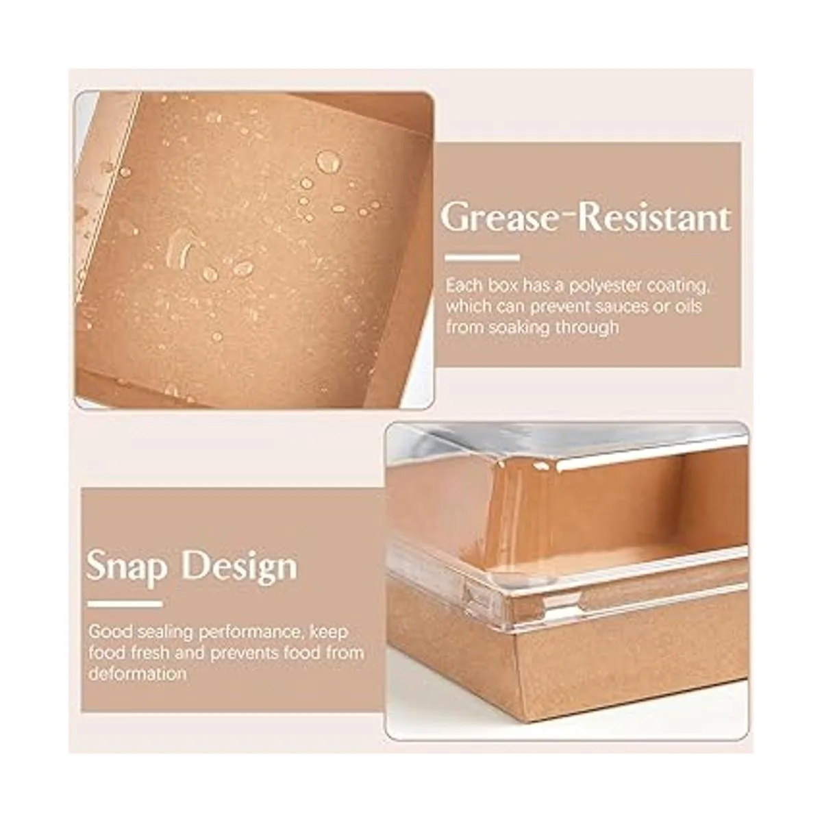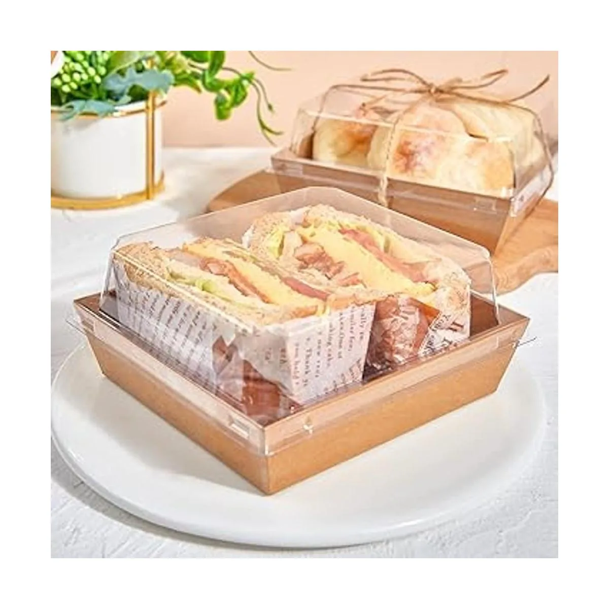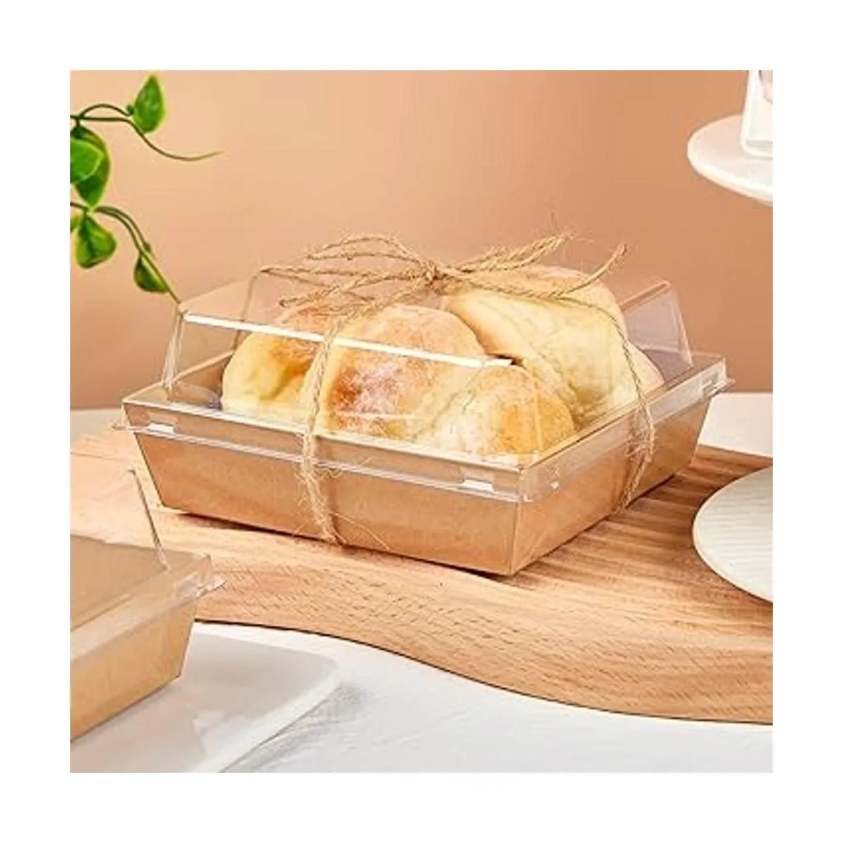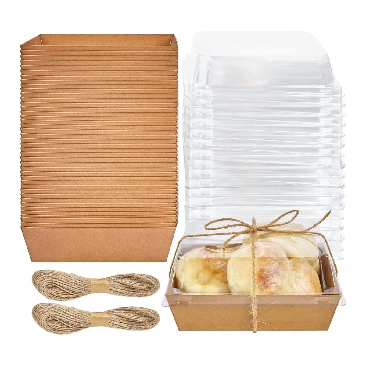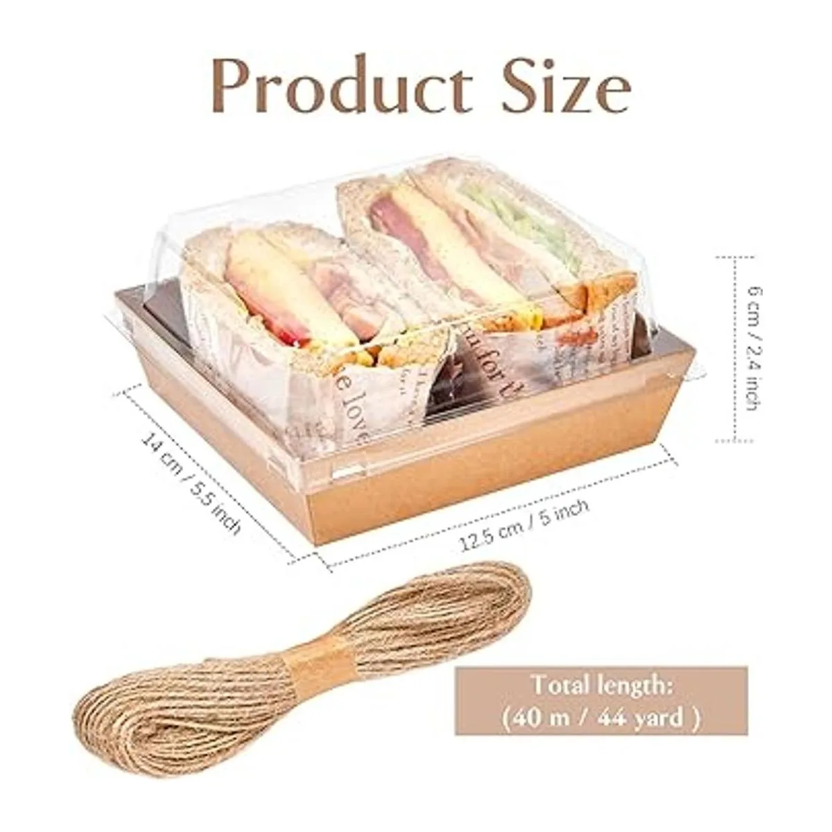 Paquete de 50 cajas de papel para charcutería con tapas transparentes, cajas cuadradas para sándwich con cordel de 44 yardas desechables para rollos suizos, fresas, pasteles de rebanadas, galletas, marrón