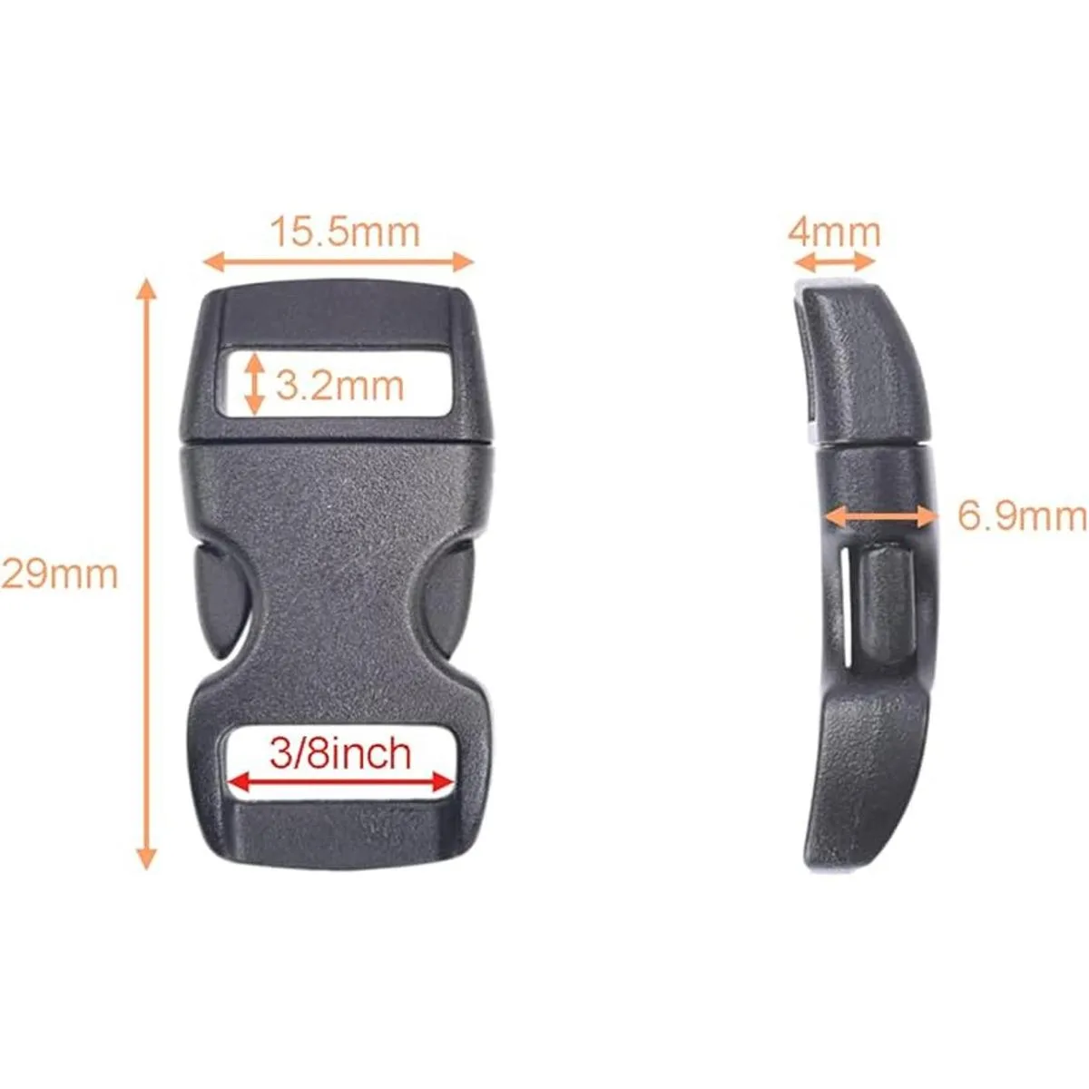Excelente diseño artesanal: las hebillas de liberación lateral de plástico de 3/8 pulgadas están diseñadas con un arco curvo. Bonita curva que se puede combinar perfectamente con pulseras de paracaídas. Tamaño perfecto y sin bordes afilados que tienen un fuerte agarre cuando está en uso. Perfecto para su uso en la fabricación de pulseras de paracaídas