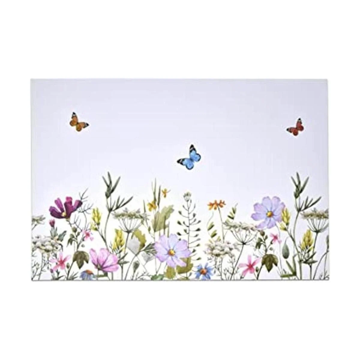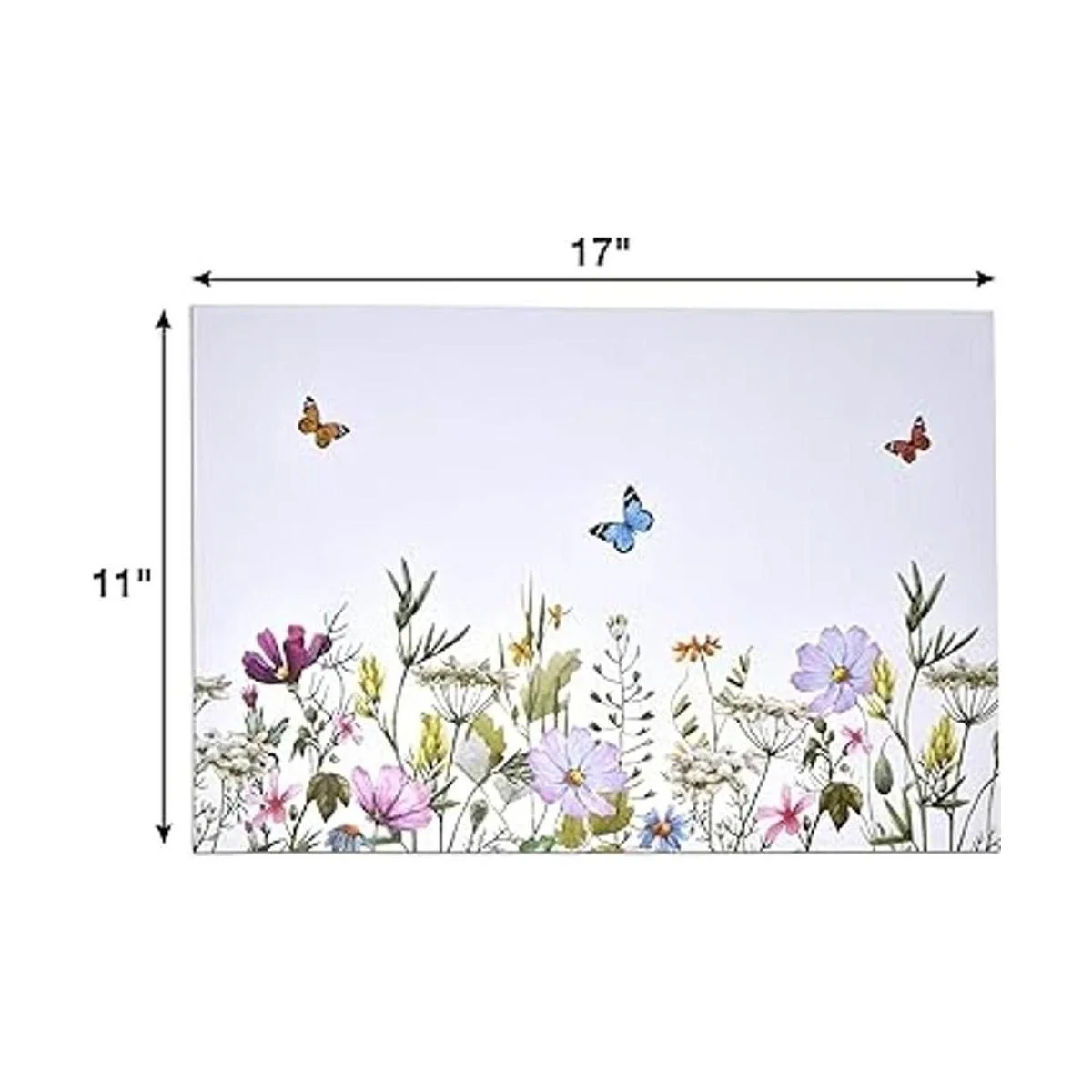 Paquete de 50 manteles individuales desechables rectangulares de papel floral. Este tapete de jardín de flores cuenta con diferentes flores surtidos con tallos verdes y hojas y mariposas que mejoran enormemente la decoración de tu mesa. Además, estos manteles individuales desechables para fiestas harán que sea fácil de limpiar después de que termine el evento.