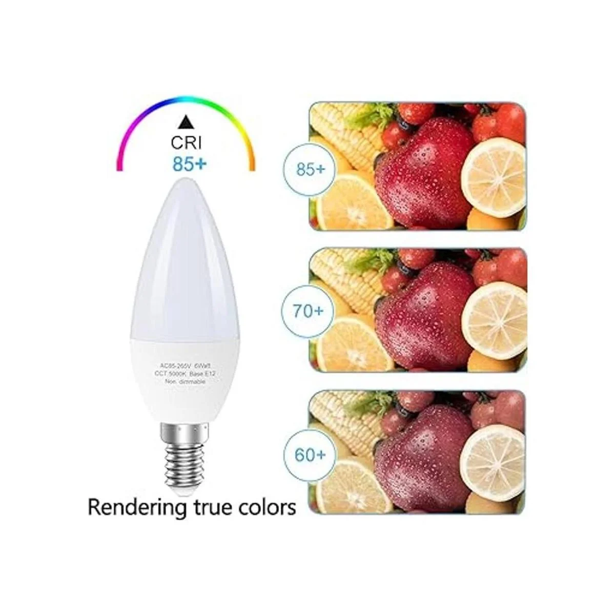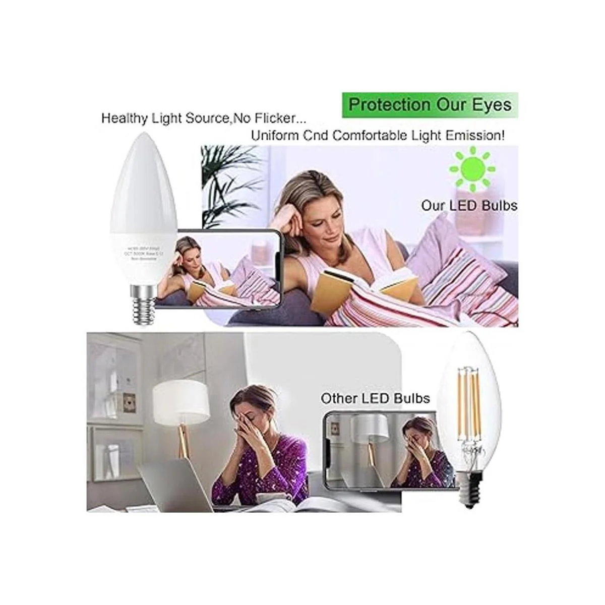 Luces saludables: nuestras bombillas LED E12 cumplen con estrictos criterios de prueba, incluyendo parpadeo, estroboscópico, deslumbramiento y reproducción de color Ra85, ofrecen una iluminación brillante pero cálida con una claridad excepcional y alto índice de reproducción cromática índice de reproducción cromática. Luces saludables, protegen eficazmente tus ojos