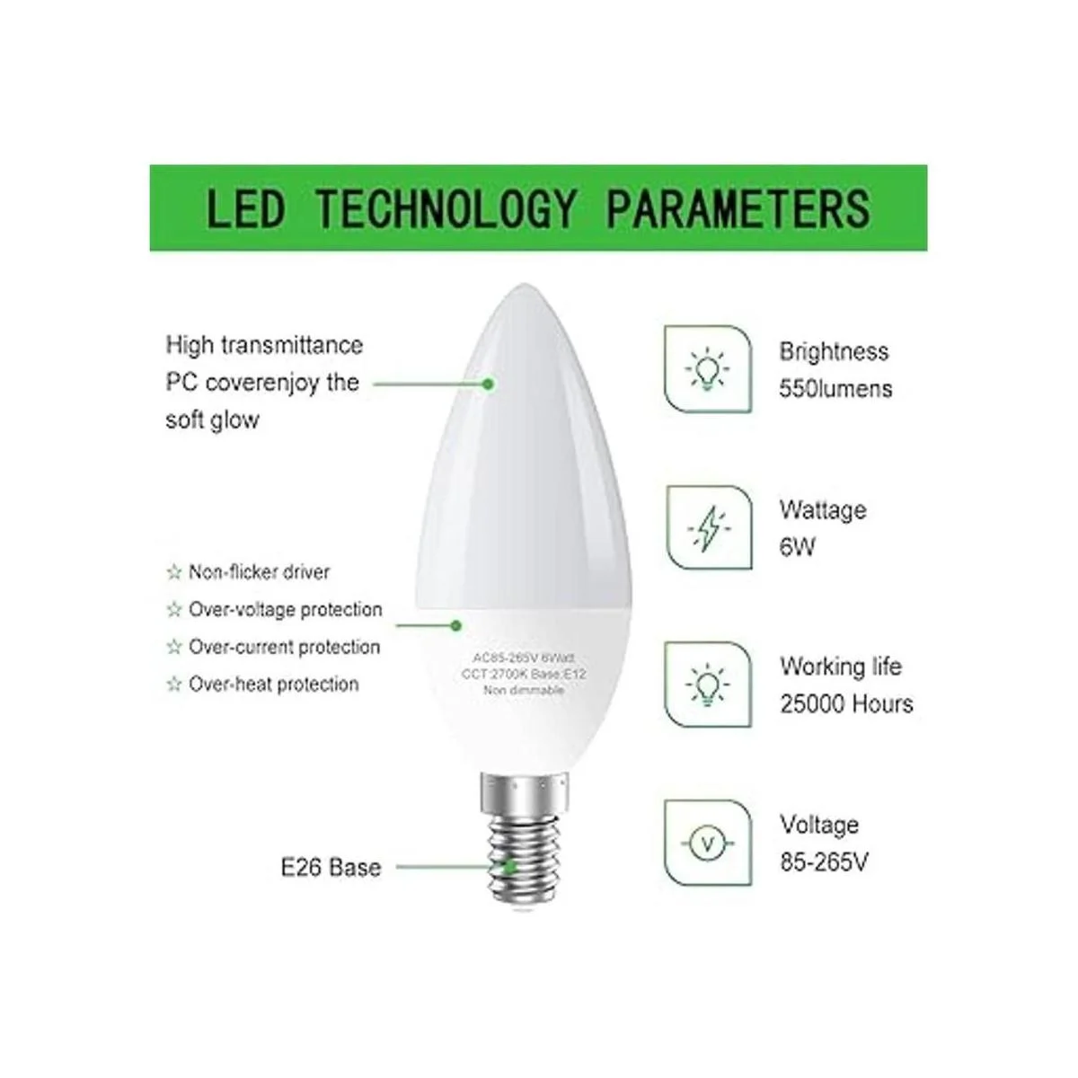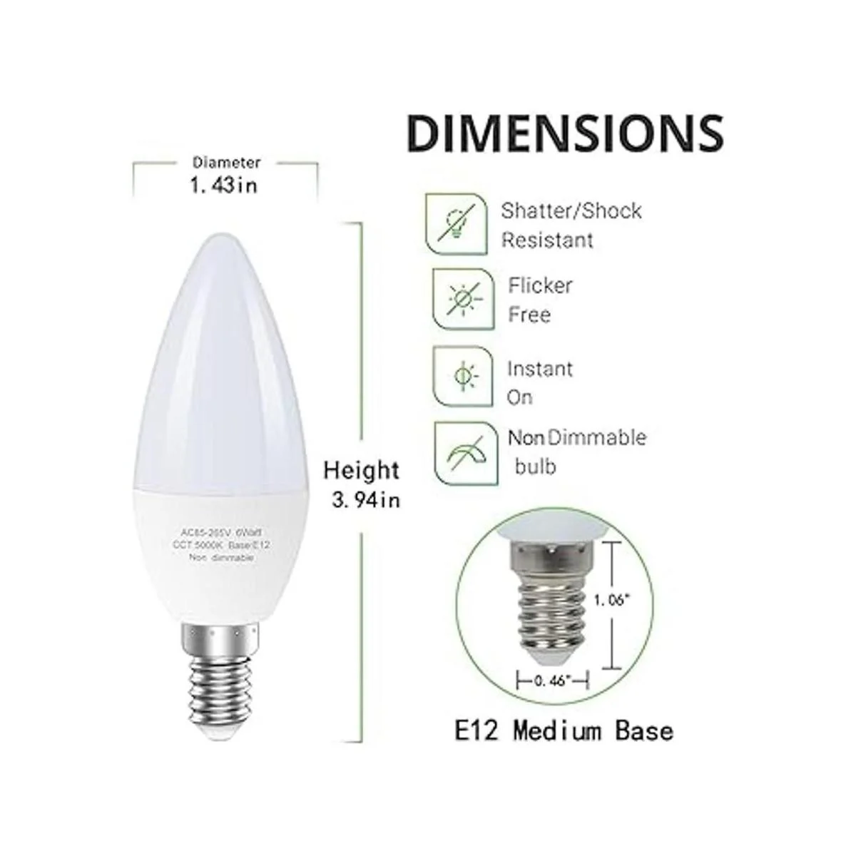 Larga vida útil: pared interior de aluminio y diseño de disipación rápida del calor. Amplía la vida útil a 25.000 horas, la bombilla de base de candelabro E12 se puede encender/apagar hasta 15000 veces, reduciendo el costo de reemplazo y mantenimiento. Es ideal para iluminación del hogar