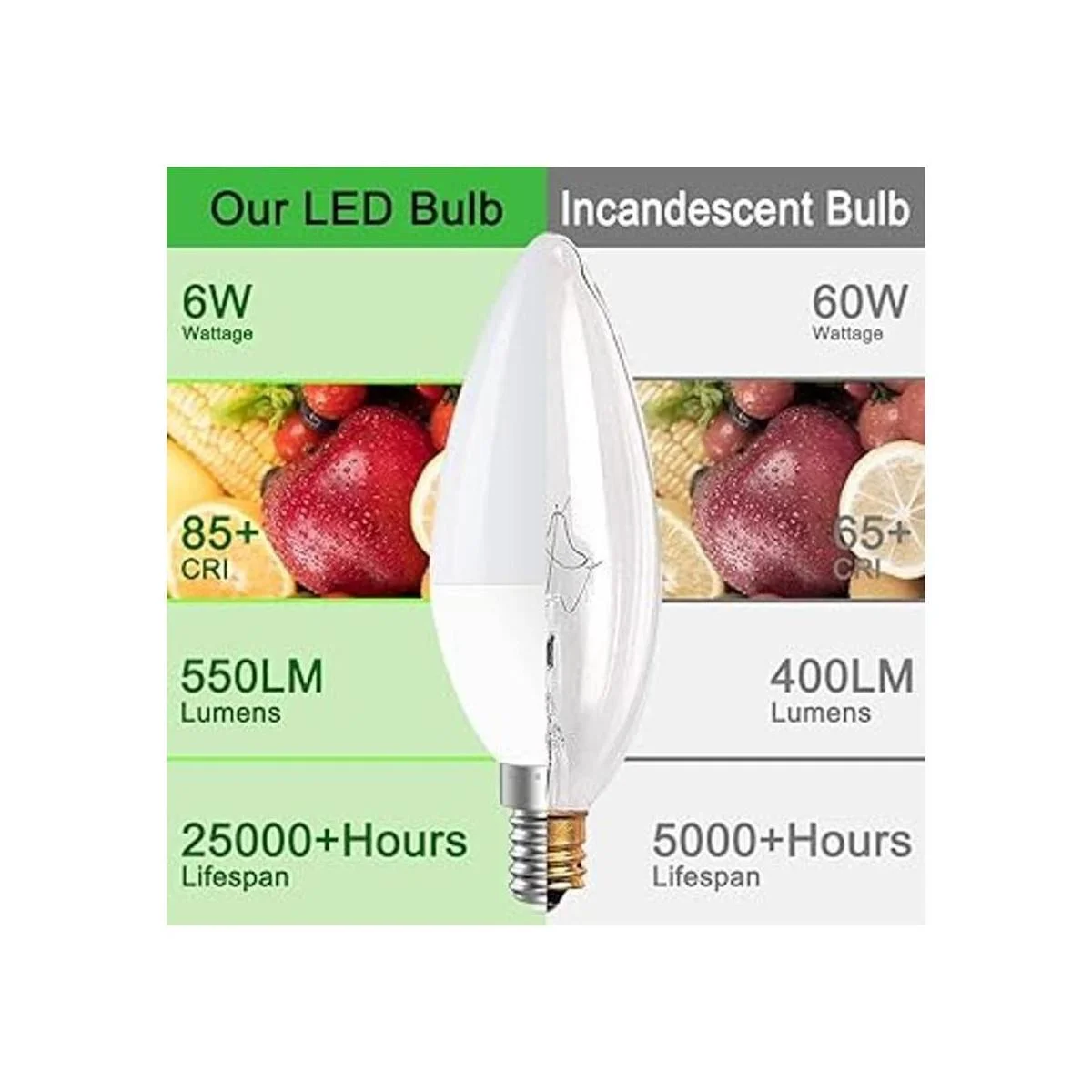 Ahorro de energía: la bombilla LED E12 de 6 W reemplaza la tradicional lámpara incandescente de 40 W y 60 W, consumiendo solo el 10 de energía, proporciona 550 lúmenes de salida de luz, ahorra hasta un 90 en tu factura de energía