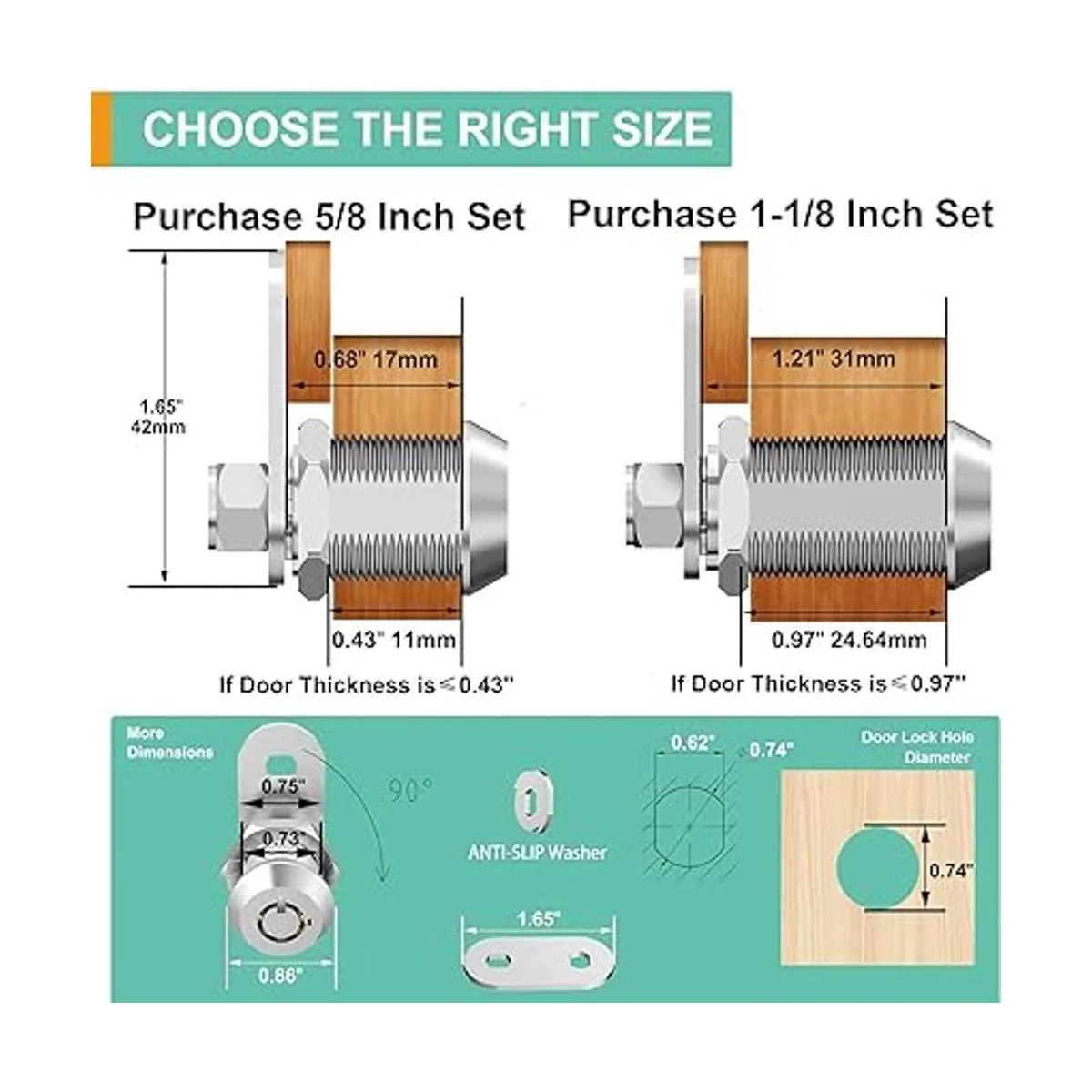 Tamaño del producto: las diferentes longitudes de las cerraduras de leva son adecuadas para diferentes grosores de paneles de puerta. Antes de comprar, comprueba la introducción de tallas en la figura 2 y elige el tamaño correcto. Longitud del cuerpo del bloqueo de leva: 0.669 in, grosor de la puerta 0.43 pulgadas, diámetro del agujero de la cerradura 0.74 pulgadas 0.748 in, placa de bloqueo: 1.65 pulgadas 1.654 in, perfecto para la mayoría de cerraduras de almacenamiento de RV, buzón, cerraduras de repuesto de caja de herramientas o cerraduras de gabinete.