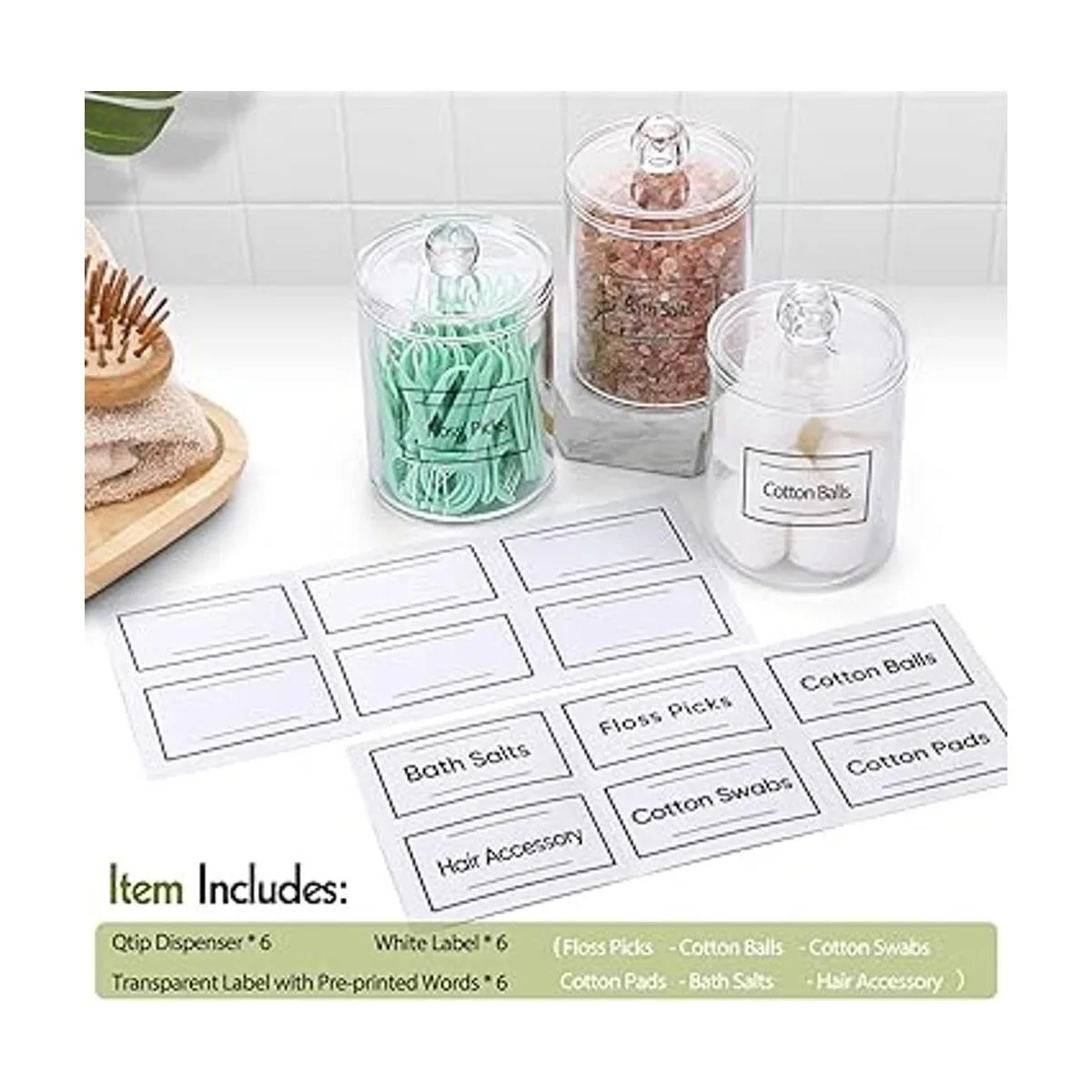 El artículo incluye 18 unidades: 6 dispensadores transparentes de 10 onzas con tapas 2.7 pulgadas de ancho, 4.1 pulgadas de altura 6 etiquetas transparentes con palabras preimpresas negras bolas de algodón, hisopos de algodón, almohadillas de algodón, púas de hilo dental, sal de baño, accesorio para el cabello 6 etiquetas blancas