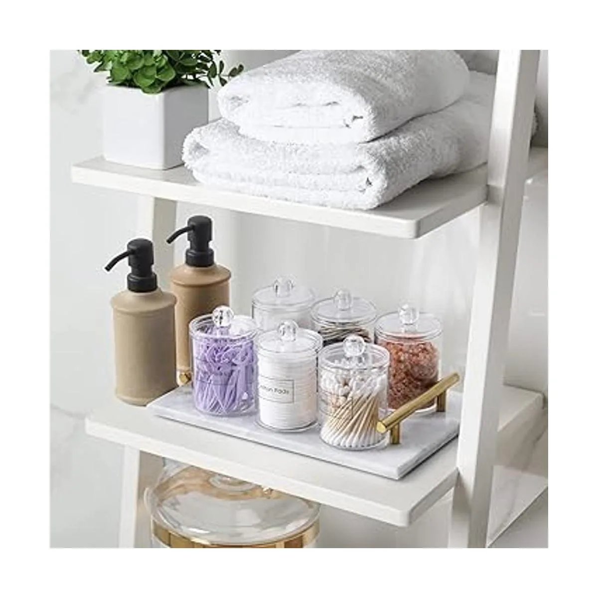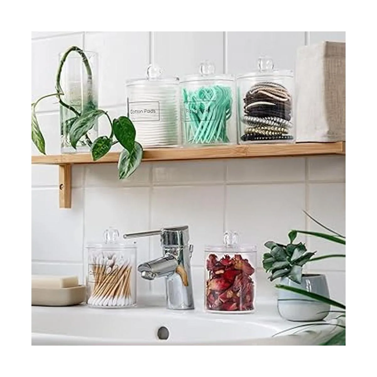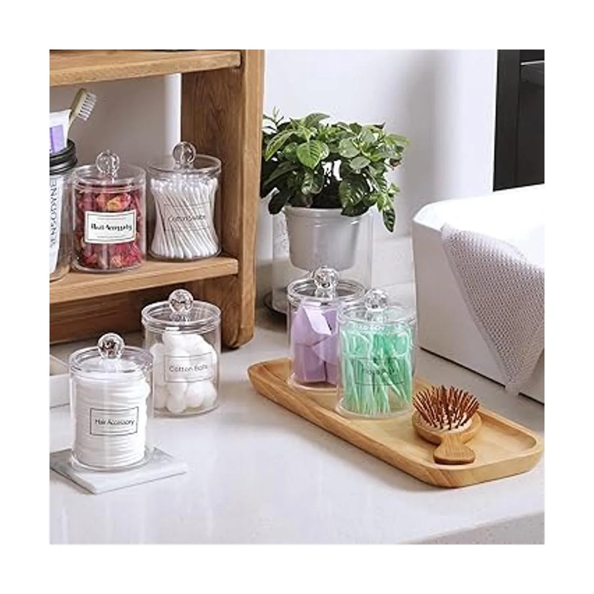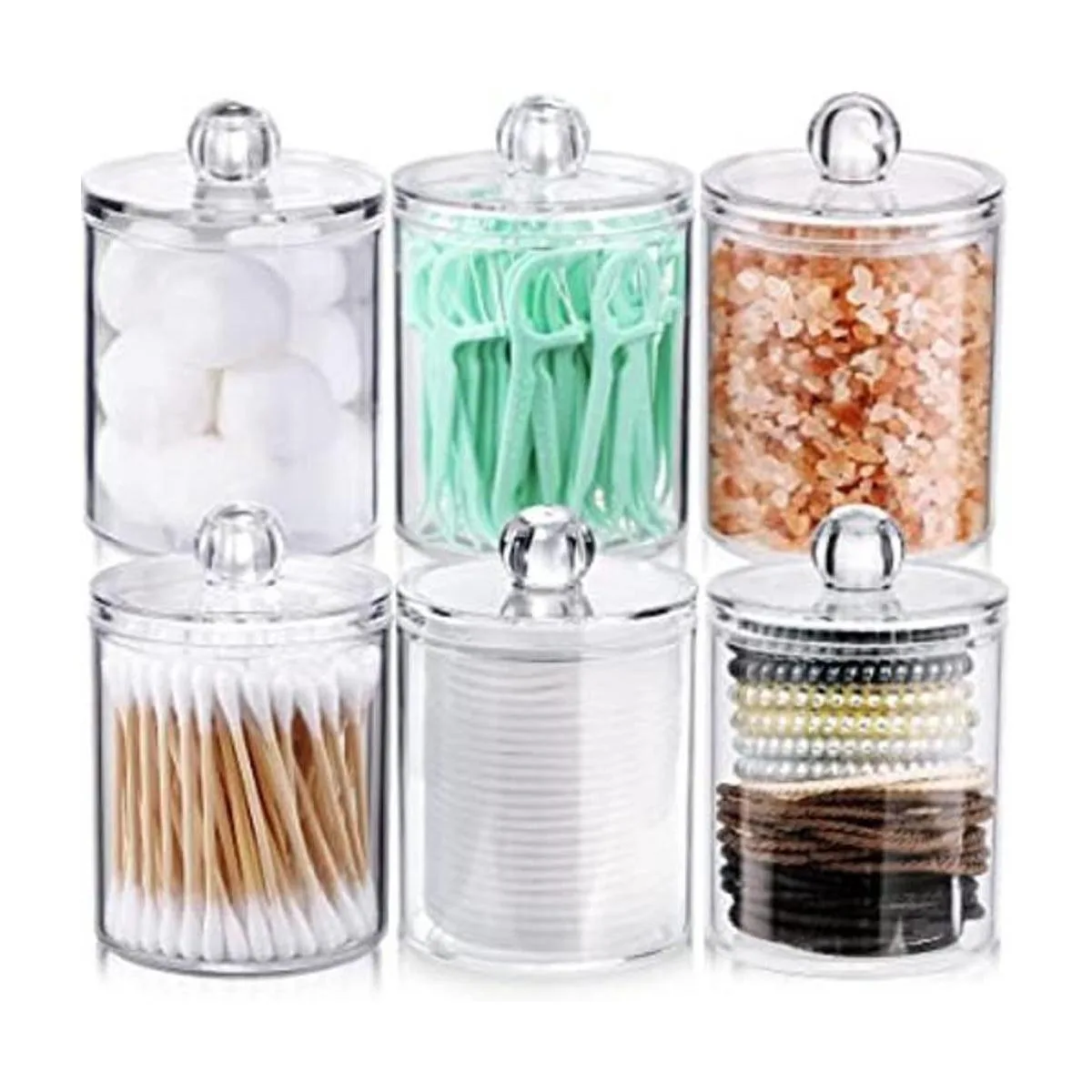 Paquete de 6 dispensadores Qtip para bolas de algodón, hisopo de algodón, almohadillas redondas de algodón, hilo dental, juego de tarros de boticario de plástico transparente de 10 onzas para organización de almacenamiento de recipientes de baño, organizador de maquillaje de tocador