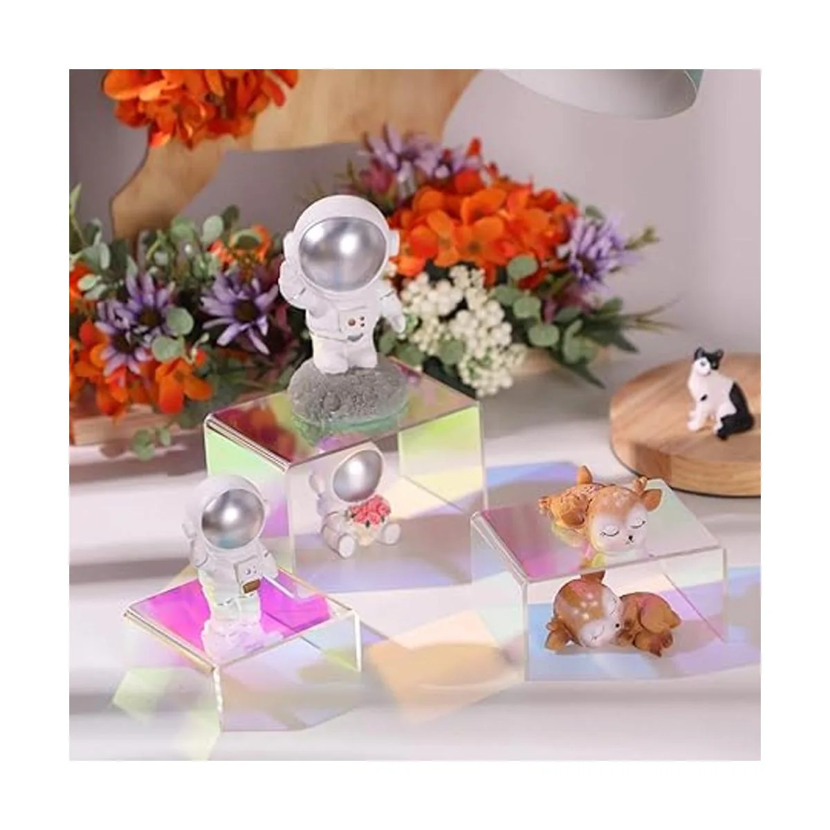 El paquete incluye: 2 elevadores cuadrados de acrílico iridiscente, cada juego contiene 3 elevadores de exhibición en 3 tamaños diferentes, 6 piezas en total; estos elevadores de exhibición están hechos de acrílico, el material se ve delicado, resistente y estable para sostener la exposición