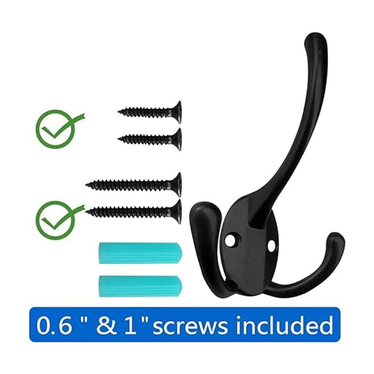 Fácil de instalar: este clásico gancho grande de tres puntas montado en la pared es muy fácil de instalar en tu hogar. Cada perchero viene con 4 tornillos de montaje de dos opciones de longitud diferentes, 2 de 0.984 in o 1 pulgada y 2 de 0.630 in o 0.6 pulgadas. Puedes utilizar nuestros tornillos de 1 pulgada y anclajes de pared huecos para instalar ganchos directamente en una pared, cuando se trata de armarios, puertas o tablero de madera, puedes utilizar nuestros tornillos de 0.6 pulgadas