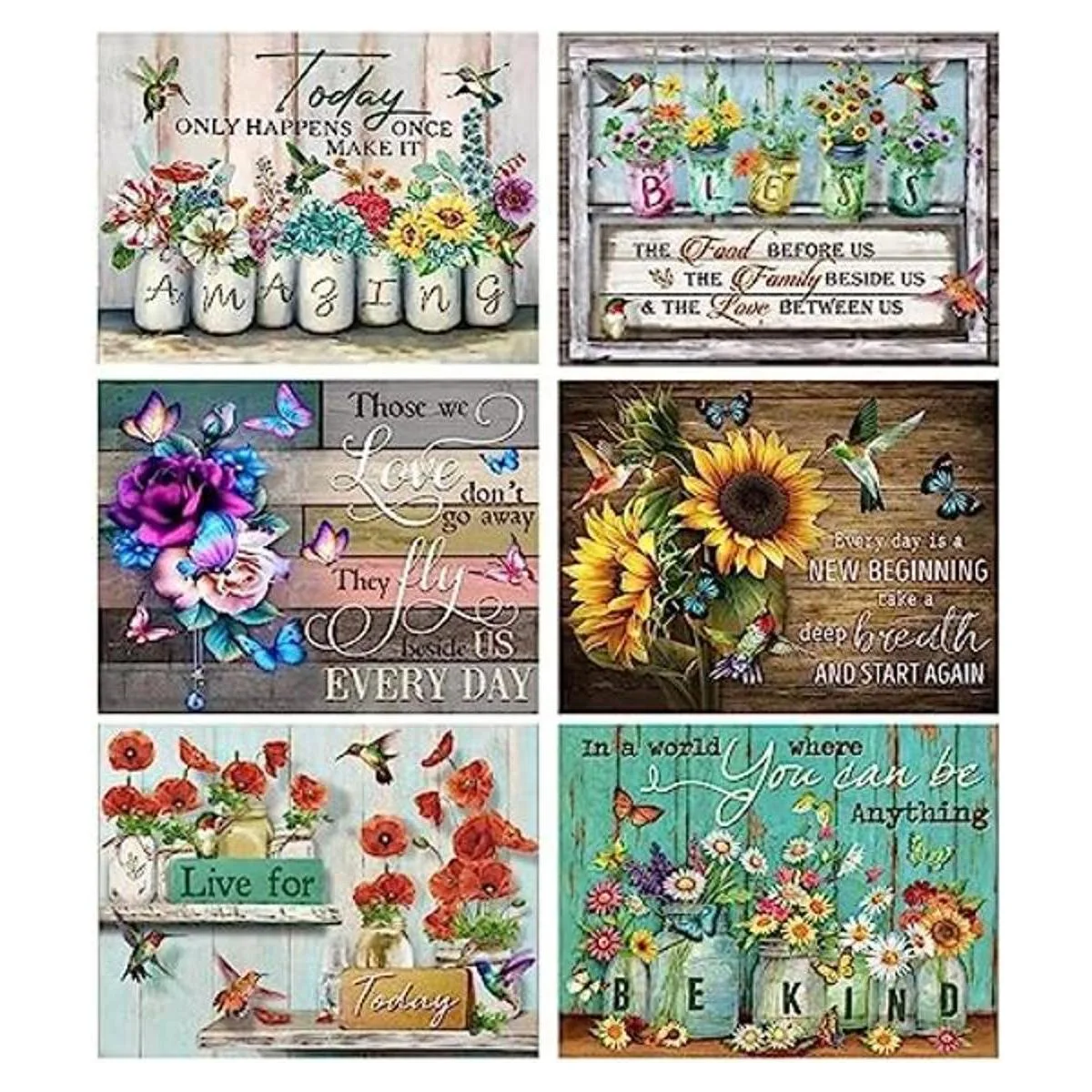 Paquete: 6 juegos de pintura de diamante 5D, cada pieza está envuelta individualmente con su propio juego de herramientas y diamantes. 6 lienzos adhesivos, 6 bolígrafos aplicadores de diamantes, 6 ceras, 6 bandejas y suficientes diamantes redondos. Viene con todos los artículos necesarios para ayudarte a terminar el arte de diamantes