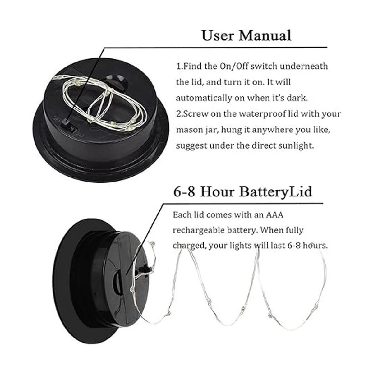 Luces solares para tapa de tarro Mason. Ahorro de energía y respetuoso con el medio ambiente. Panel solar 100 alimentado por energía solar, no requiere cableado externo. Batería recargable AAA de 1,2 V/600 mAh incluida. Necesita 68 horas de tiempo de carga con luz solar fina, se ilumina durante aproximadamente 812 horas o más.