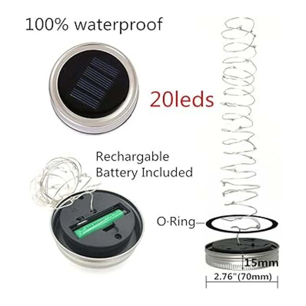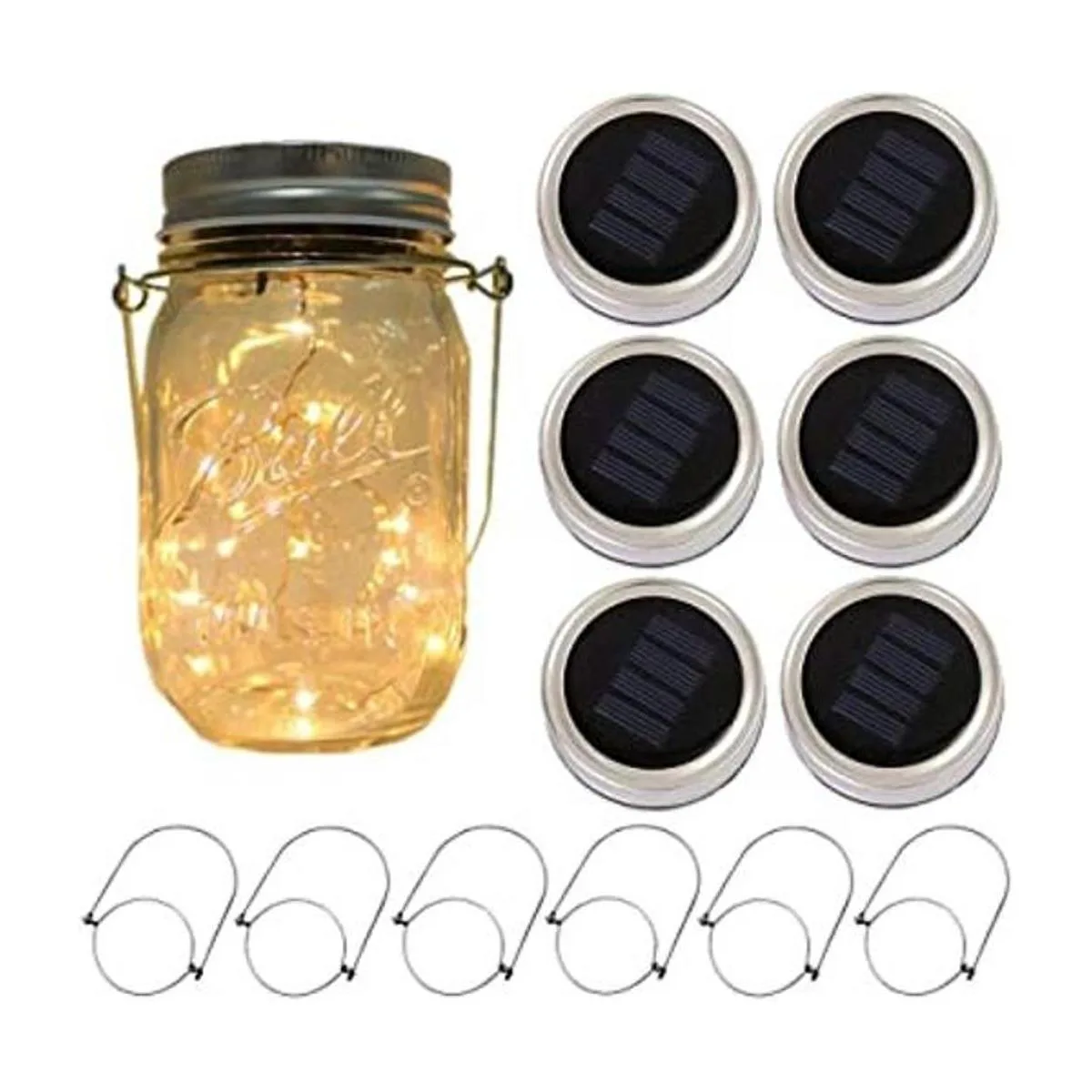 Paquete de 6 luces de tarro Mason alimentadas por energía solar, 20 LED 6 ganchos incluidossin tarro, iluminación colgante de hadas impermeable de vidrio blanco cálido, tapas de cadena para exteriores para tarros de boca regulares para decoración de lámpara de patio