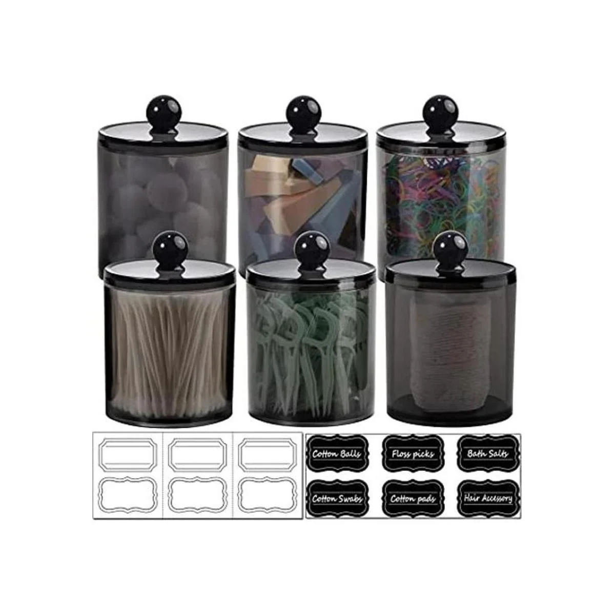 Paquete de 6 tarros de boticario Qtip para baño con etiquetas, contenedor de almacenamiento Qtip de plástico transparente para bolas de algodón, hisopo de algodón, rondas de algodón, púas de hilo dental, pinzas para el cabello negro