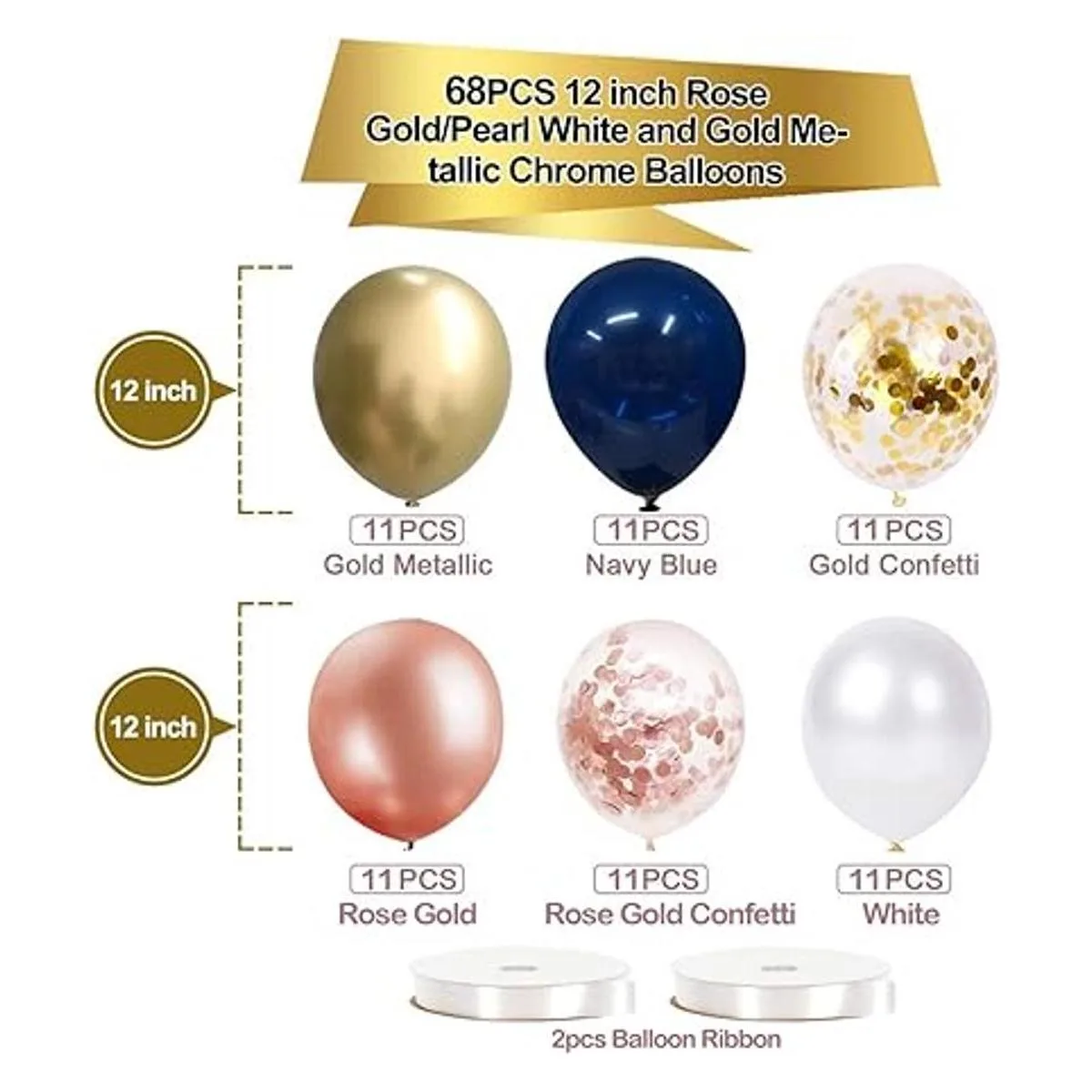 El paquete incluye: este kit de globos de oro rosa azul marino incluye 68 piezas, 11 globos azul marino, 11 globos blancos, 11 globos de confeti de oro rosa, 11 globos de oro rosa, 11 globos de confeti dorados, 11 globos metálicos dorados y 2 cintas de globos. Son ideales para añadir una dosis extra de diversión a cualquier evento de entretenimiento