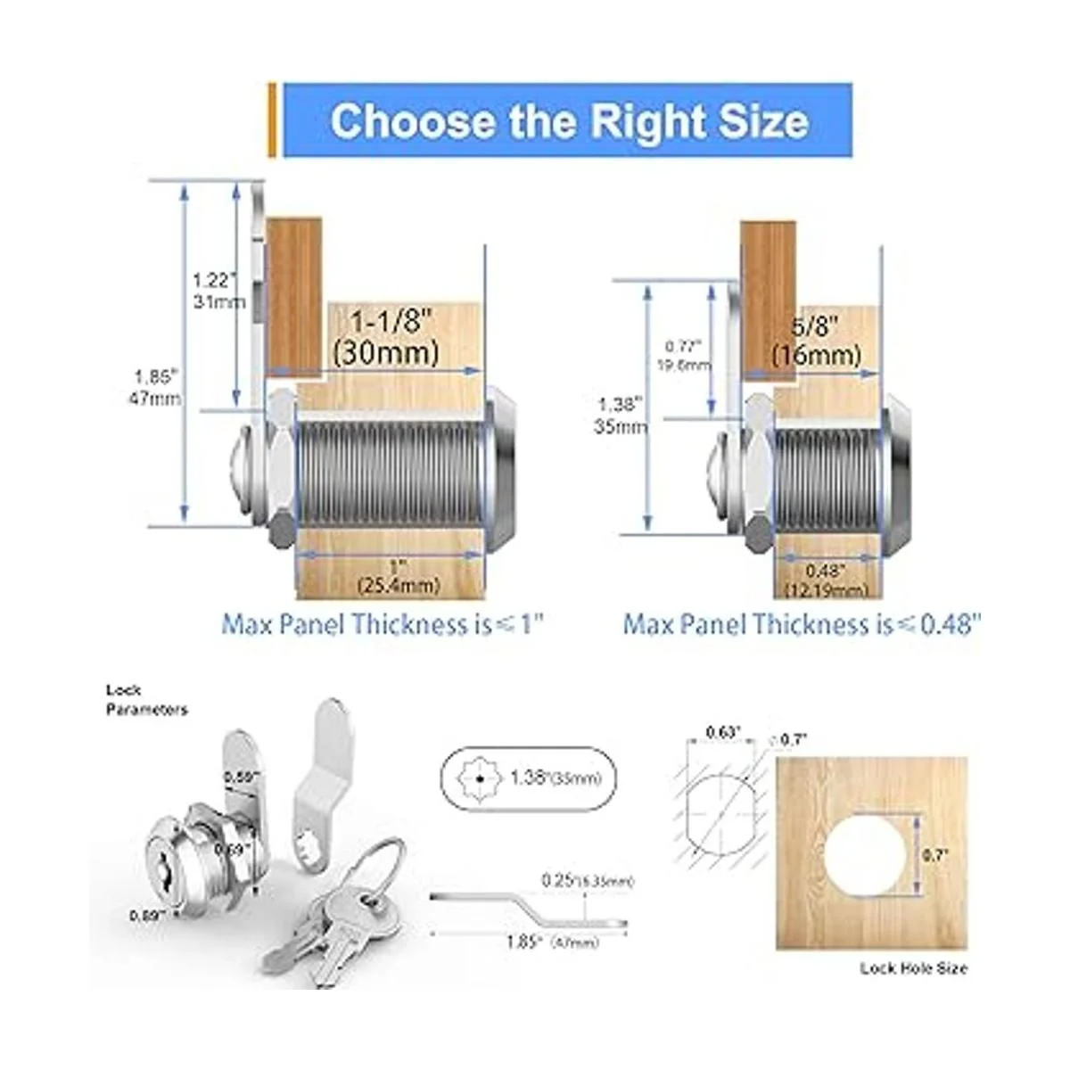 Tamaño del producto: diferentes longitudes de cerraduras de archivador son adecuadas para diferentes grosores de paneles de puerta. Antes de comprar, comprueba la introducción de tallas en la figura 2 y elige el tamaño correcto Longitud del cuerpo de la cerradura de leva: 0.630 in, grosor de la puerta 0.480 in, diámetro del agujero de la cerradura: 0.709 in, dos placas de diferentes formas de 1.835 in y 1.378 in. Las cerraduras de gabinete con llaves son ampliamente utilizadas en buzón, caja de herramientas, archivadores, puertas de caravanas y caravanas.