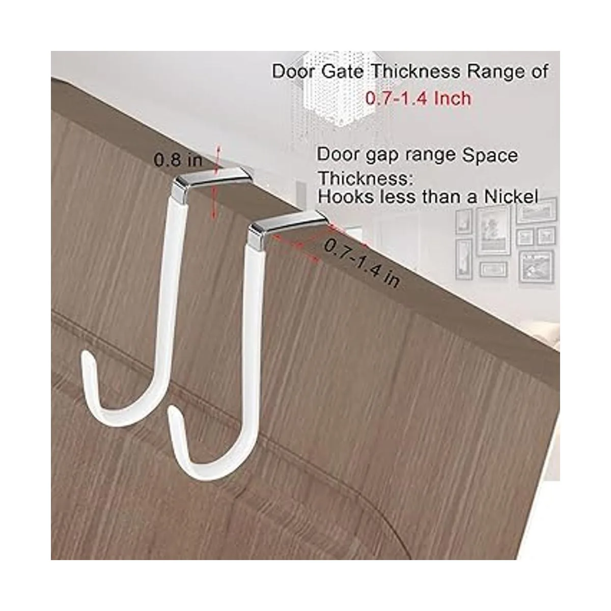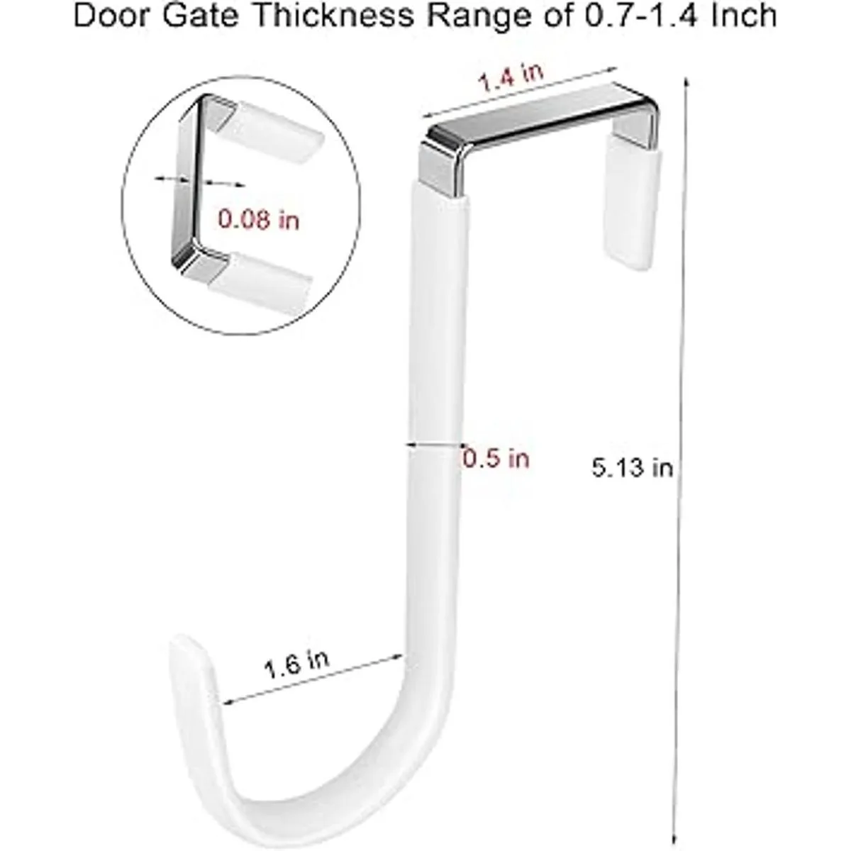 Tamaño de los ganchos de puerta: los ganchos de puerta son adecuados para un rango de grosor de puerta de 0.7 a 1.4 pulgadas, el grosor de los ganchos de puerta es de 0.08 pulgadas, aplicable a la mayoría de anchos de puertas estándar, comprueba el tamaño del producto al comprar.