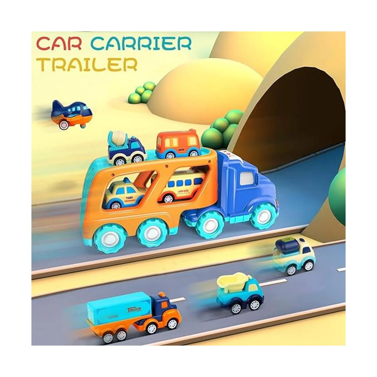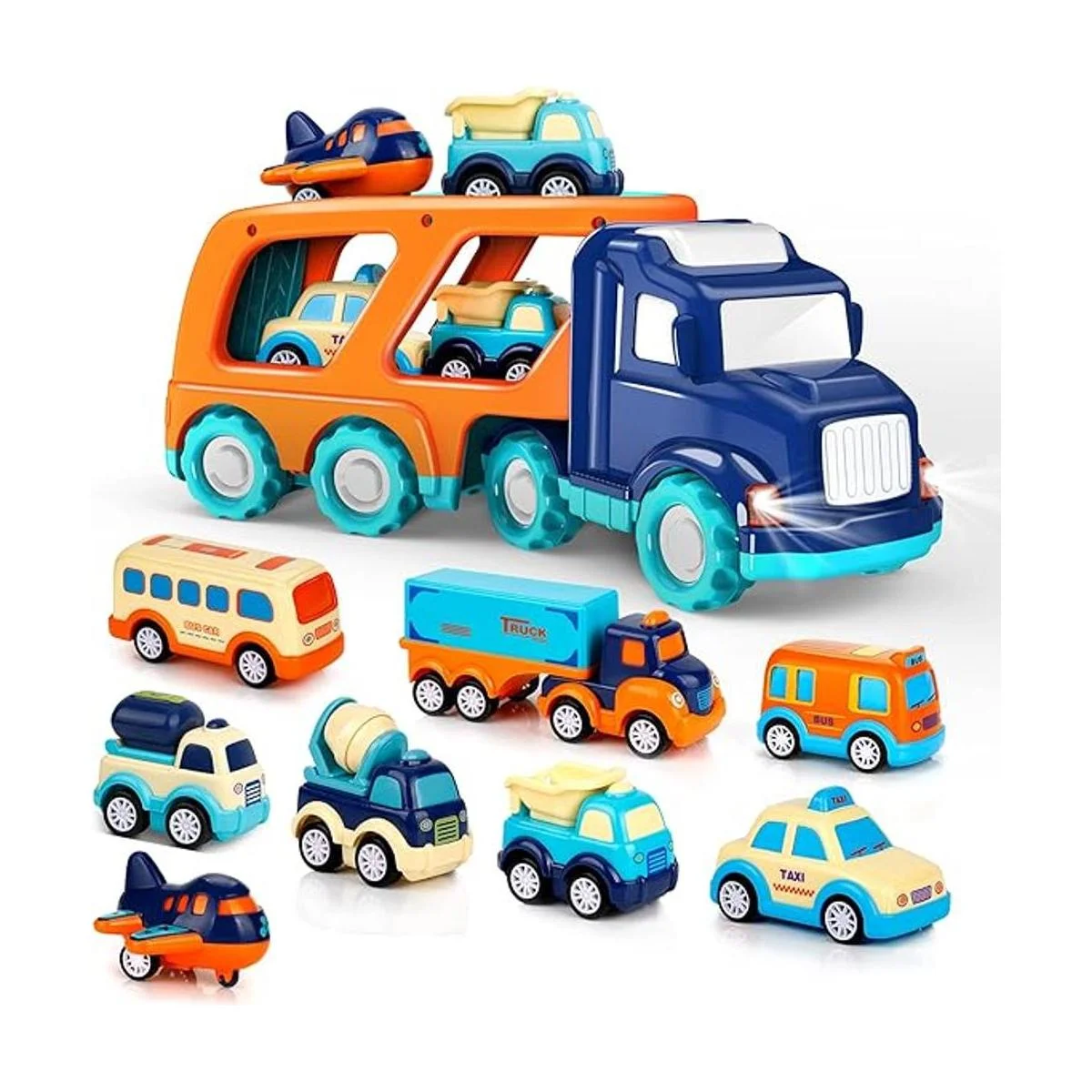 Paquete de 9 juguetes para autos para niños y niñas de 2, 3, 4, 5 años, camión de transporte grande con 8 pequeños y lindos camiones de tracción, coloridos vehículos surtidos, camión portador con sonido y luz