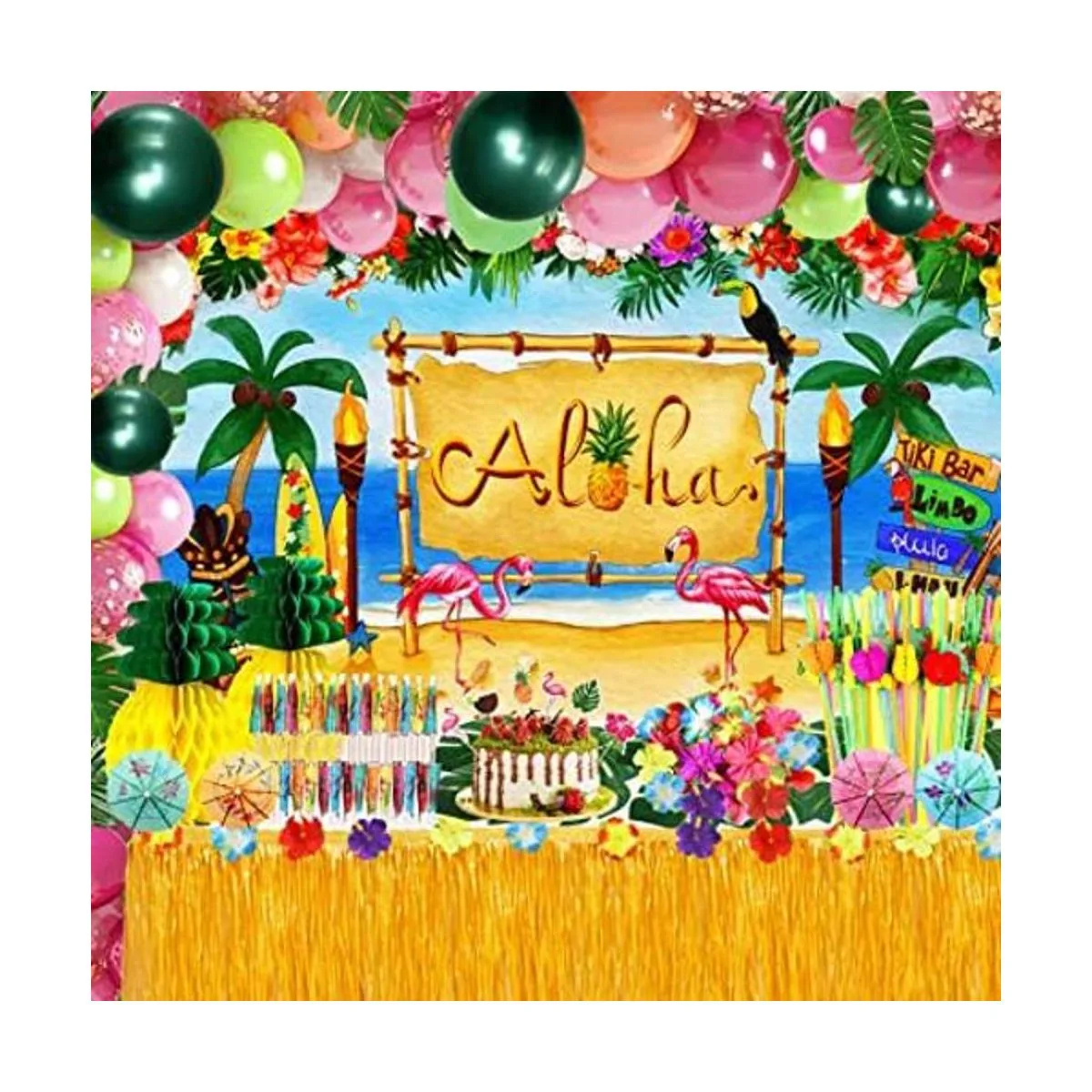 Todas las decoraciones seleccionadas con gran calidad 1 La falda de mesa sintética cuenta con velcro autoadhesivo perfecto para decorar la mesa de banquete de tamaño estándar. Fondo de fondo Aloha hecho de tela de poliéster con impresión de alta definición, sin arrugas. Arco de globos de látex en 7 colores con kit de montaje para tu comodidad para añadir un toque festivo a tu fiesta.