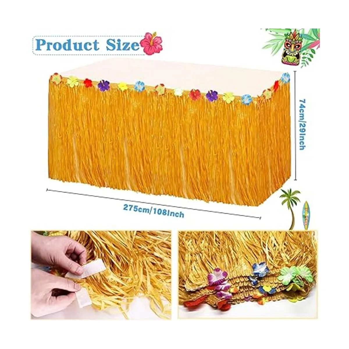 Lista de paquetes de fiesta hawaiana Luau: fondo grande de poliéster Aloha 1, falda de mesa de color paja sintética de 9 pies 1, centro de mesa de panal de abeja de piña 2, globos de látex 44, kit de montaje incluido, hojas de palma 12, flores de hibisco 24, pajitas 3D 24, adornos para cupcakes 24.