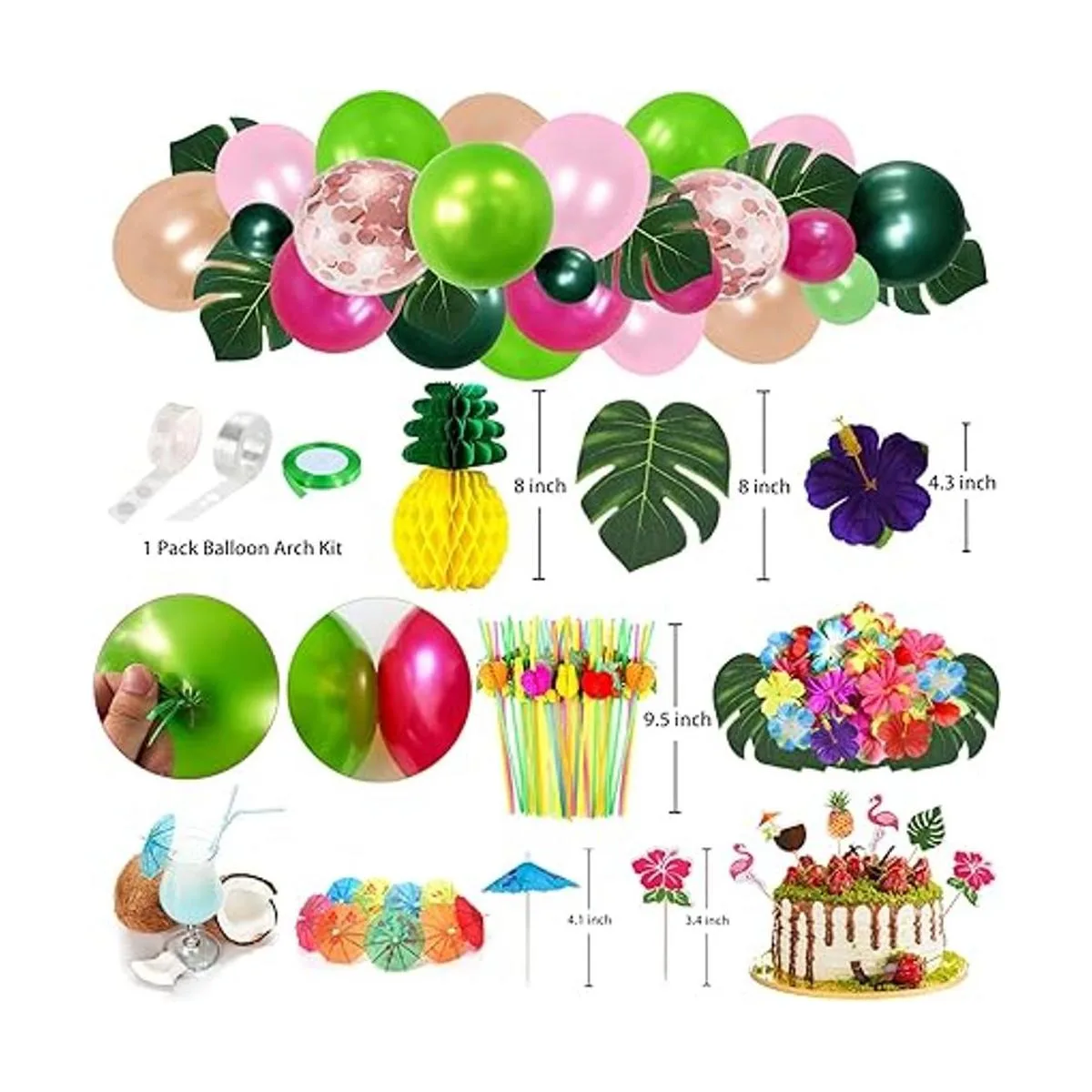 Paquete de decoración de fiesta hawaiana Luau 159 piezas, kit de suministros de fiesta de verano con temática de playa tropical incluyendo falda de mesa, telón de fondo, globos, pajitas, hojas de palma de hibisco, decoración de alimentos, piñas