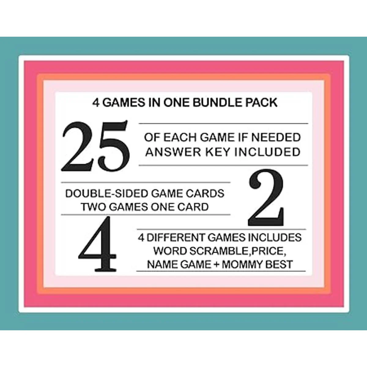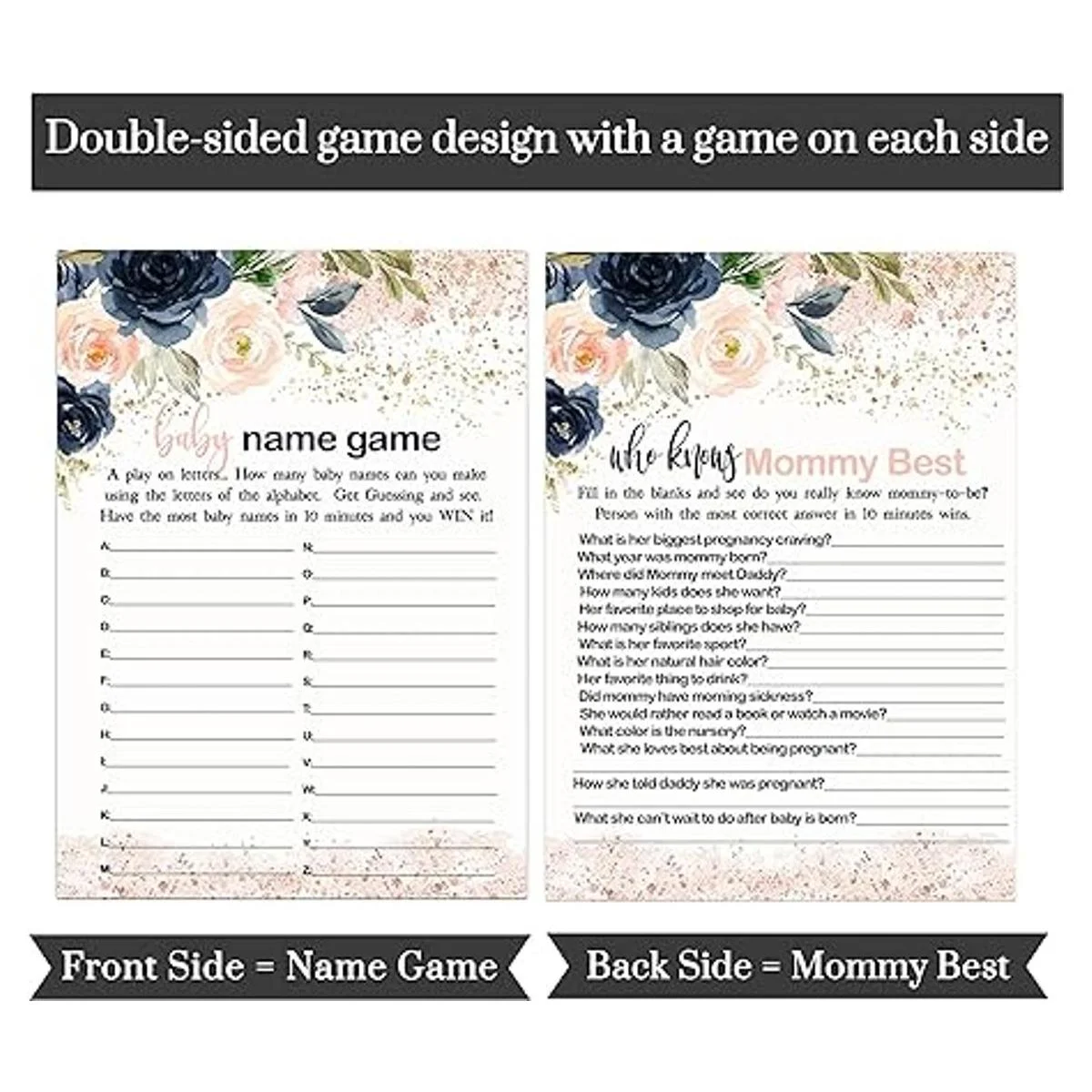 Paquete de juego de baby shower para 25 invitados, juego de 4 juegos de doble cara que conoce a mamá, juego de nombre de bebé, diseño floral rústico, tamaño 5 x 7, fiesta inteligente de papel