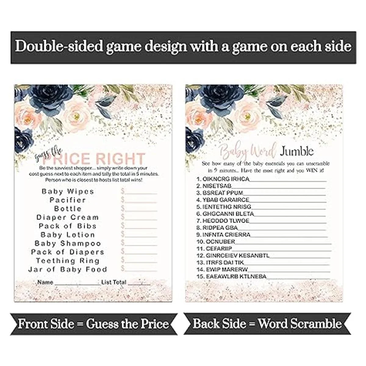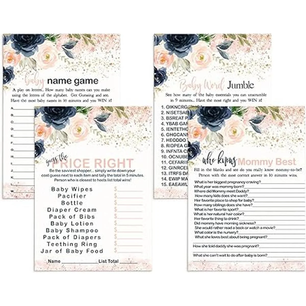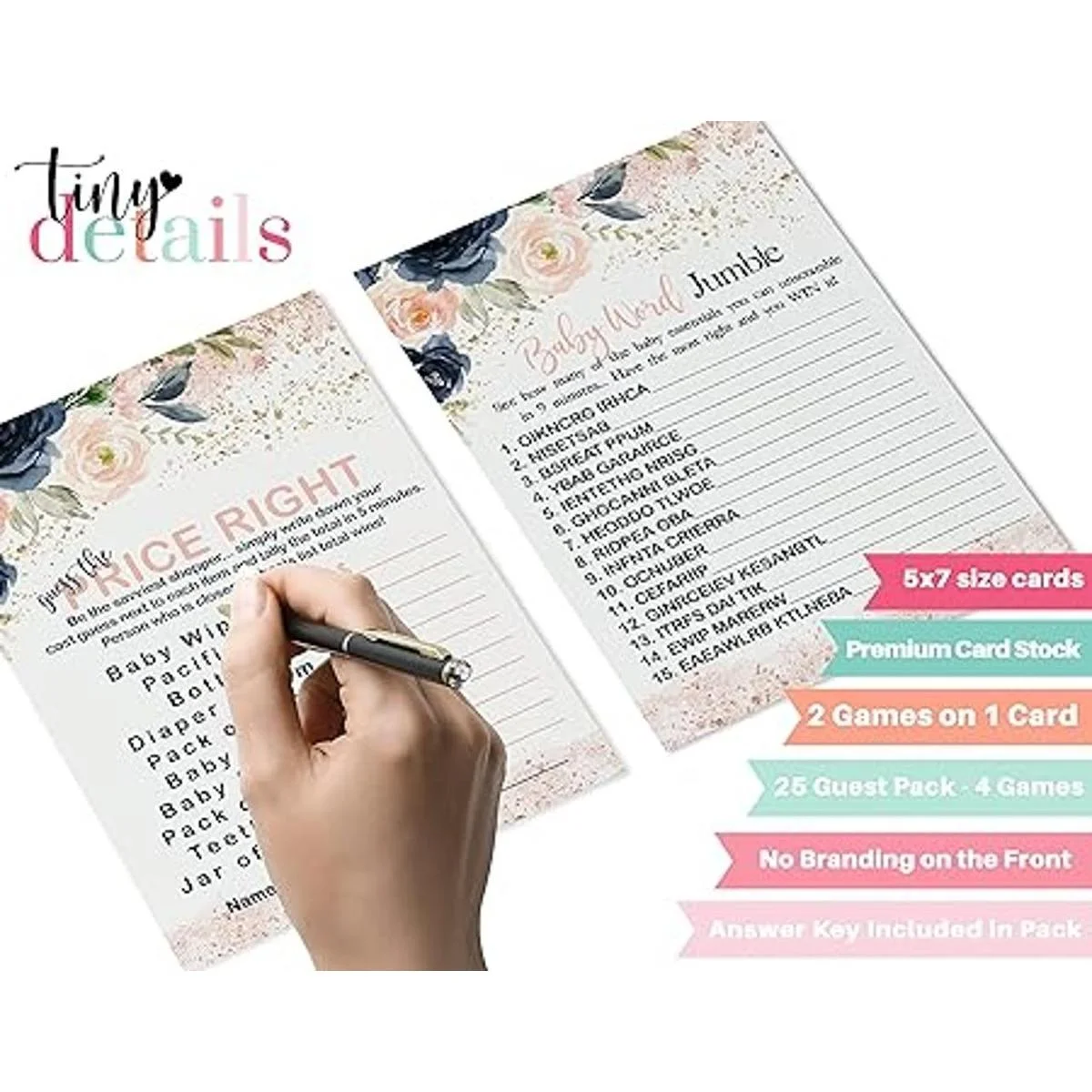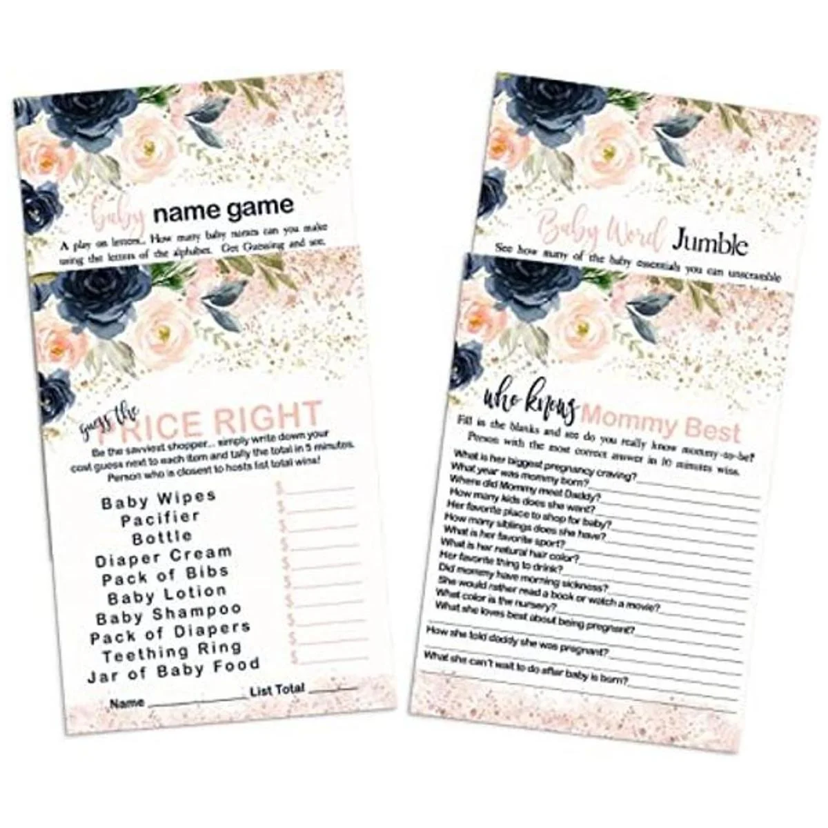 Lo que obtienes: paquete de juego 4 en 1 para baby shower impreso con diseño de flores rosas y azules con vegetación. Cada tarjeta de juego individual mide 5 x 7 pulgadas e impresa en cartulina premium de 120 libras, suficientes juegos de baby shower para 25 jugadores.