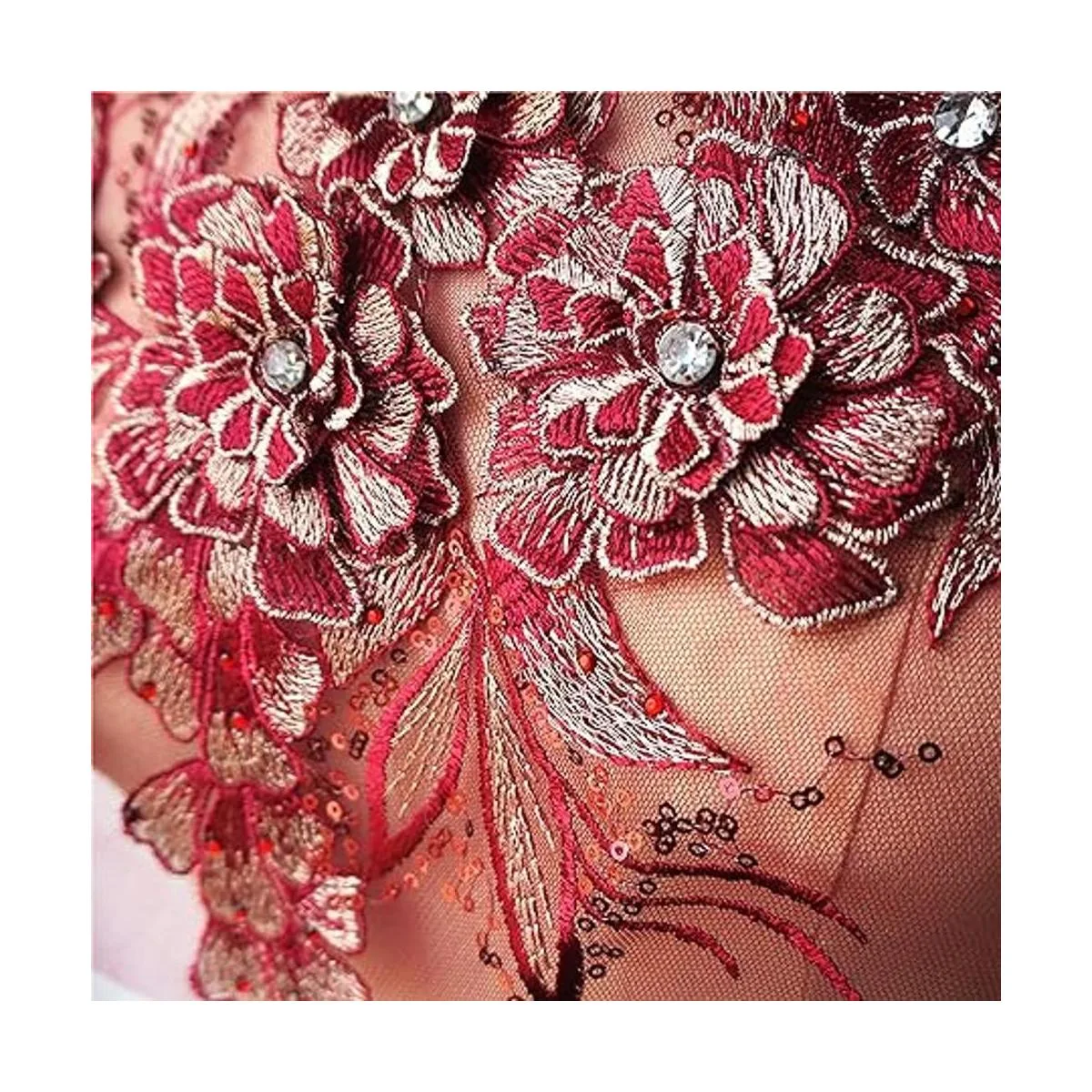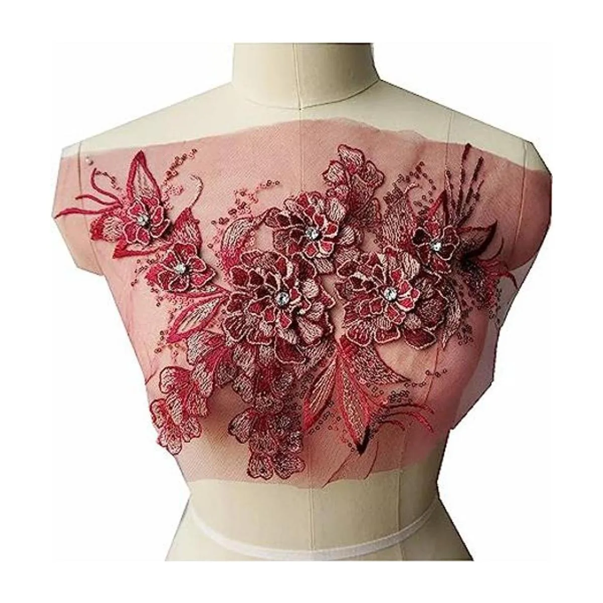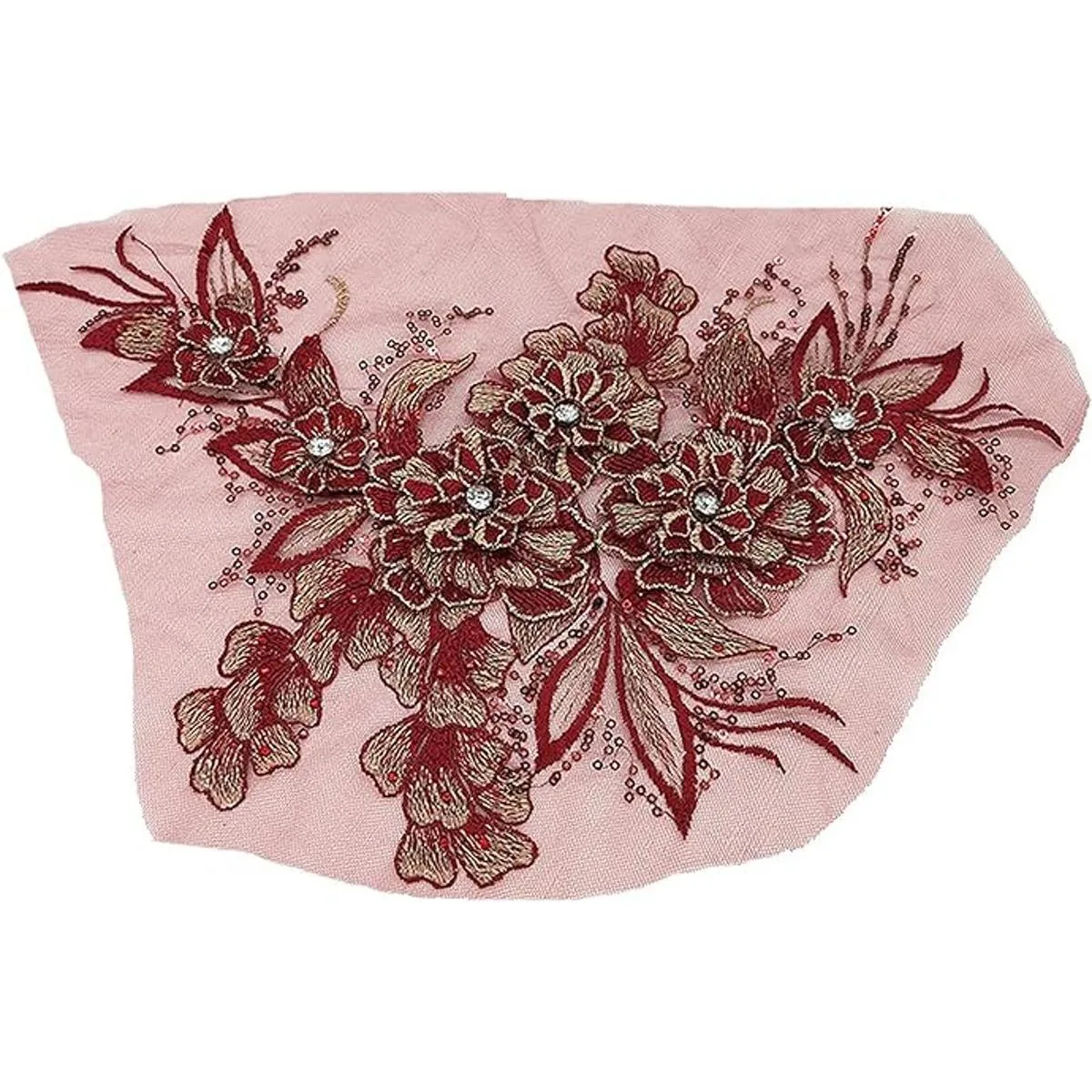 Parche bordado de malla con encaje de hojas de flores en 3D, con lentejuelas y diamantes de imitación, para manualidades, bodas, vestidos de noche, ropa, parches hechos a mano, decoración de álbumes de recortes rojo vino