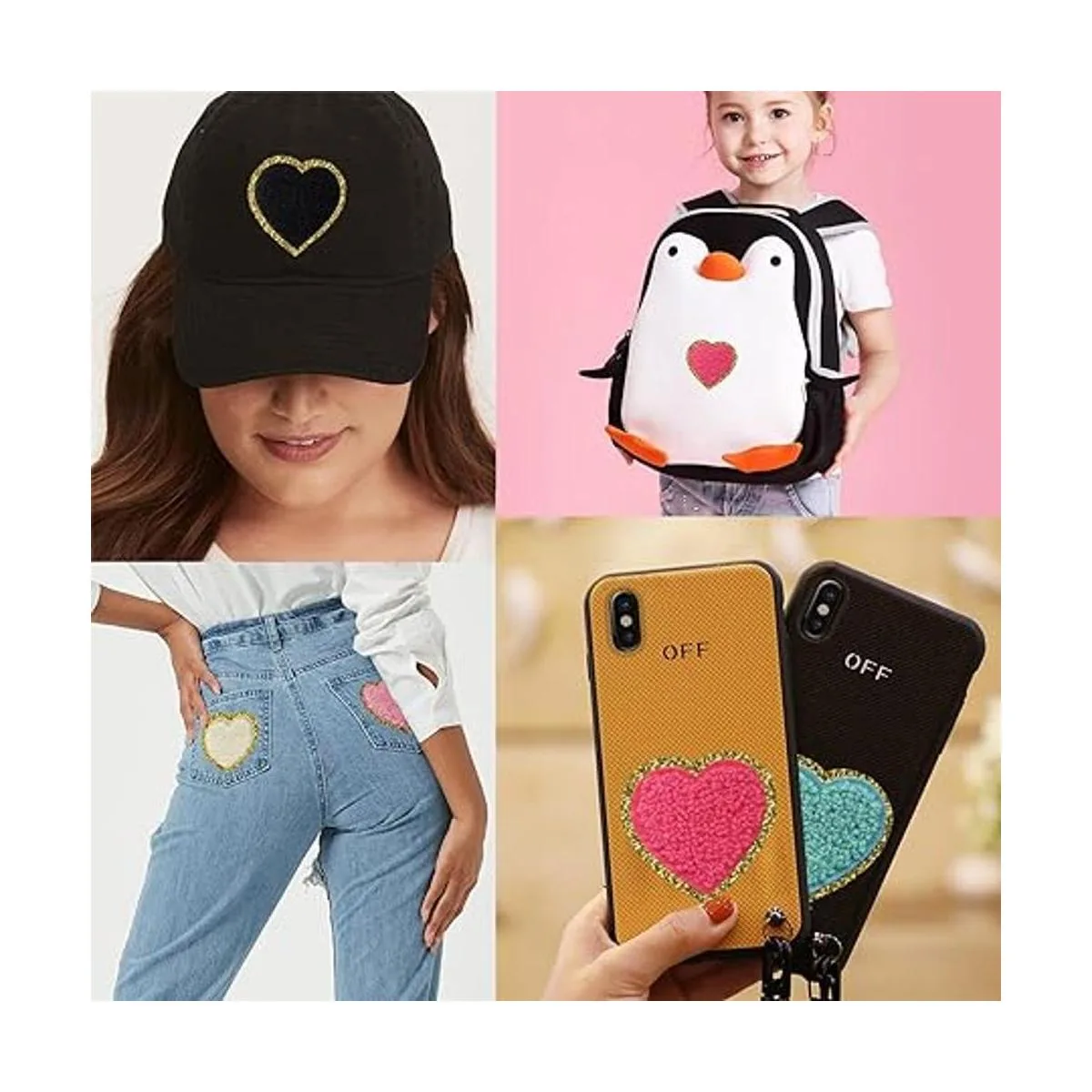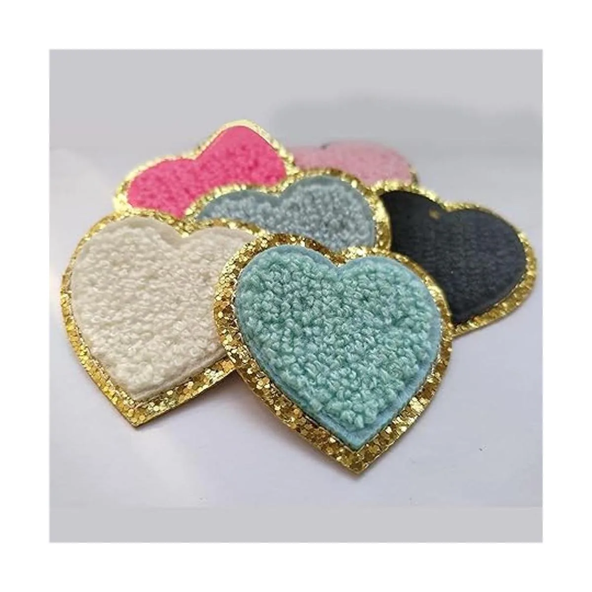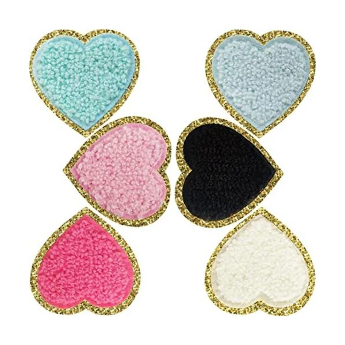 Parches de corazón de chenilla con purpurina, 6 parches para planchar en el corazón, elegante parche de felpilla bordado con purpurina con borde dorado de lentejuelas para chaquetas, ropa, mochila, decoración de sombreros