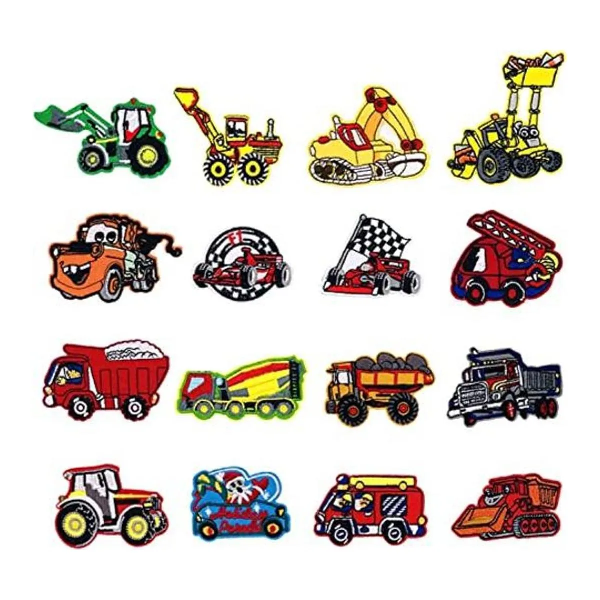 Lo que obtienes: 16 parches de tamaño variado para excavadoras, coches de carreras, camiones de bomberos, coches; material: tela.