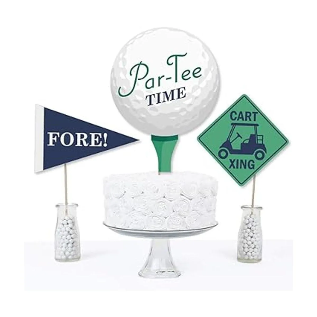 ParTee Time Centro de mesa para fiesta de golf. Tamaño cinco pelotas de golf en una mesa de camiseta, 8.25 pulgadas de ancho x 11 pulgadas de alto; cinco adornos de mesa Xing, 7 pulgadas de ancho x 7 pulgadas de alto; y cinco adornos de mesa de pancarta, 8 pulgadas de ancho x 5.25 pulgadas de alto. El diseño único y la variedad de piezas hacen de este kit de decoración de mesa una impresionante adición a cualquier fiesta temática de golf.