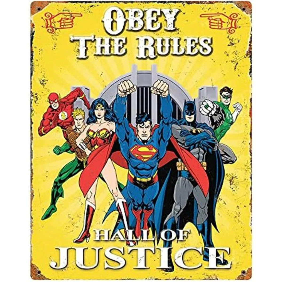 El letrero de metal en relieve de la Liga de la Justicia es un complemento imprescindible para cualquier fan de superhéroes