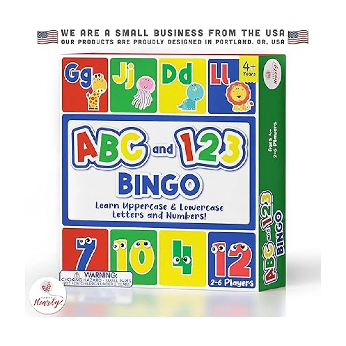 Juego clásico para aprender: este clásico juego de mesa de bingo es una manera perfecta y divertida para que los niños aprendan sus ABC y 123. Incluye 6 tablas de juego de doble cara, 26 fichas de letras y números, 72 fichas para marcar tu tablero, bolsa de terciopelo para almacenar tus fichas, instrucciones y una caja resistente para albergar todas tus piezas de juego.