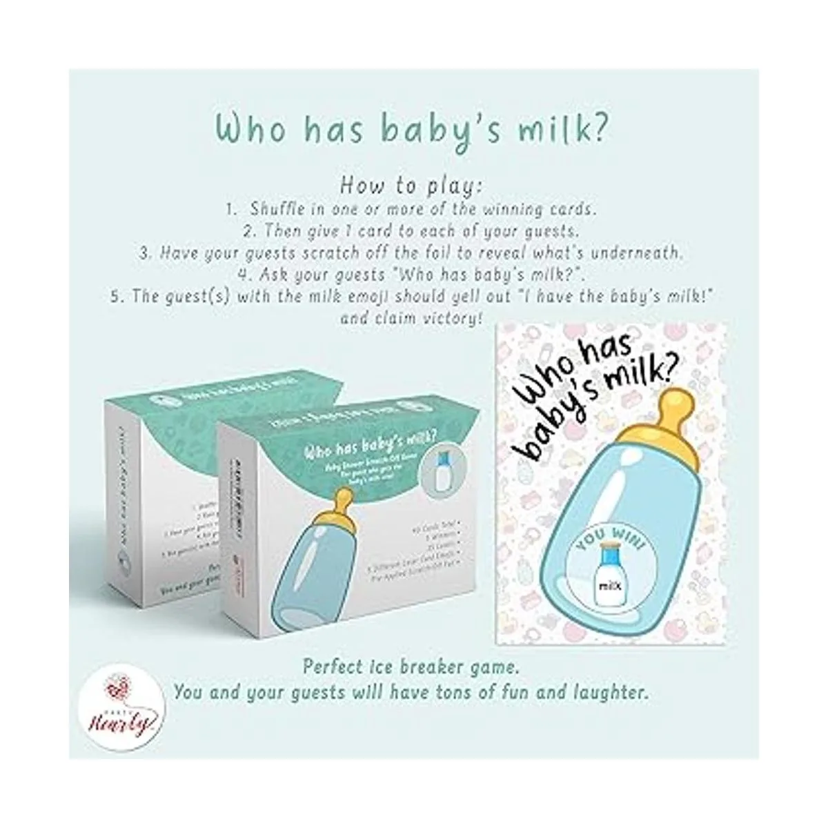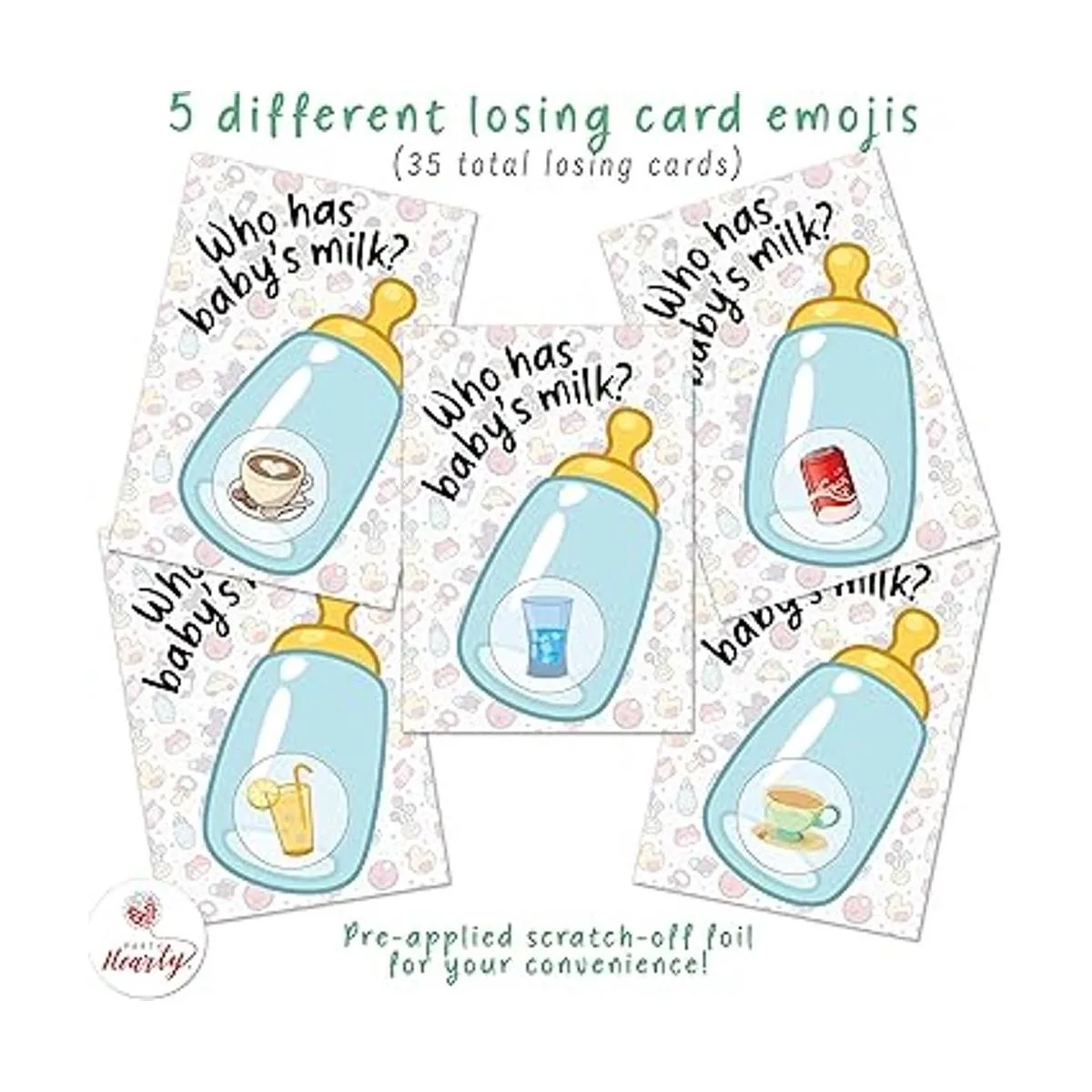 Party Hearty Juegos de baby shower, 40 tarjetas de rifa, Who Have Baby Milk Emoji Scratch Off Lotería, 5 ganadores, 5 diseños diferentes de tarjetas de perdedor, neutrales de género, actividad para rompehielos, premios de puerta