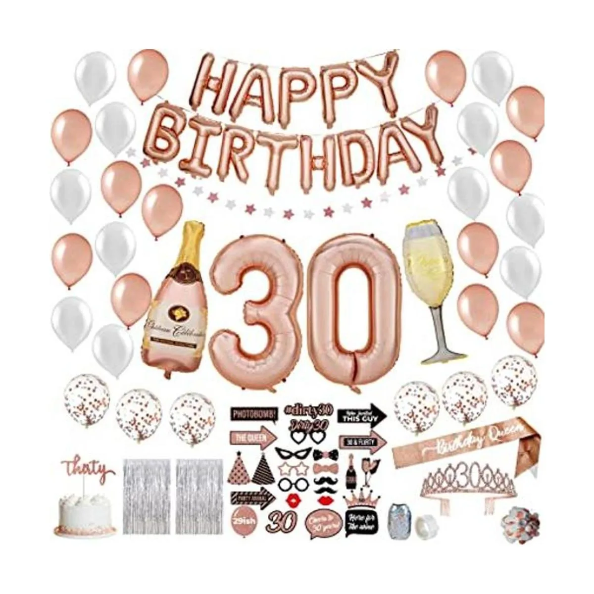 PartyHooman Decoraciones de cumpleaños número 30 para mujeres con banda de cumpleaños 30 y tiara de diamantes de imitación, globos de cumpleaños 30, 2 fondos de aluminio con 25 accesorios de sesión de fotos premontados Cumpleaños sucio 30