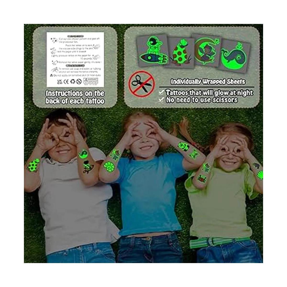 Fácil de usar y quitar: elige el que te guste, y luego boca abajo sobre la piel, humedece el tatuaje de temperatura con agua y espera 10 segundos. A continuación, retira suavemente la superficie blanca. Recibirás un bonito tatuaje para niños Consejos: los tatuajes luminosos deben activarse bajo la luz durante unos minutos, lo que puede hacerlos más luminosos en la oscuridad.