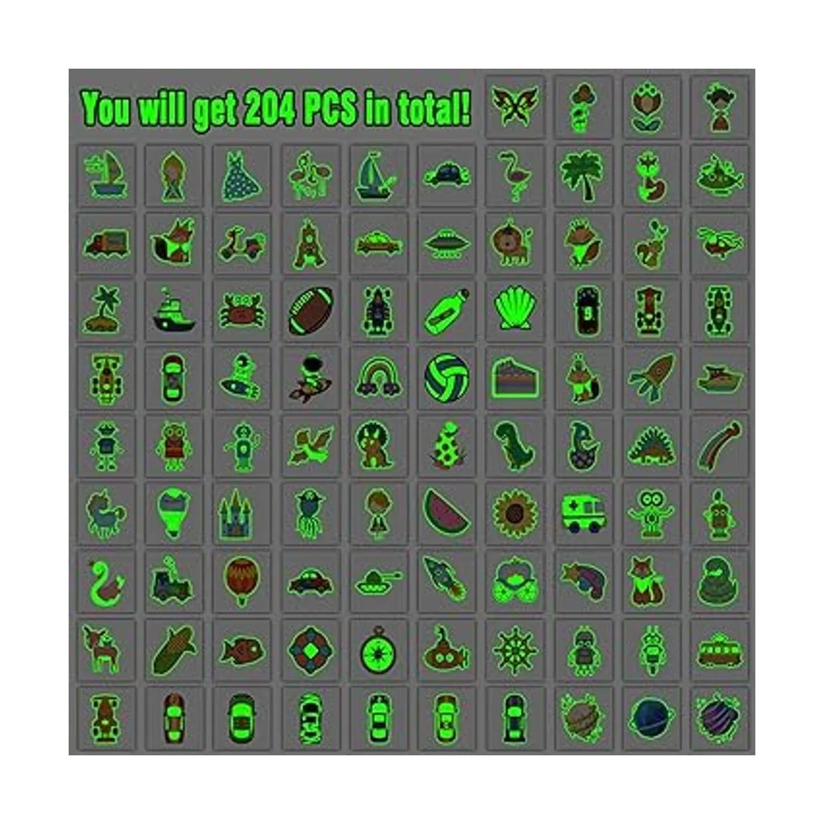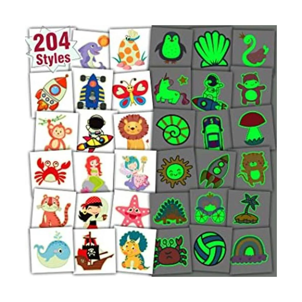 204 estilos mixtos brillantes tatuajes temporales para niños Estás buscando un regalo sorpresa para niños sin gastar mucho dinero Los tatuajes luminosos para niños de Partywind son una elección perfecta. Los estilos mixtos incluyen unicornio, dinosaurio, sirena, pirata, espacio, coches, etc.