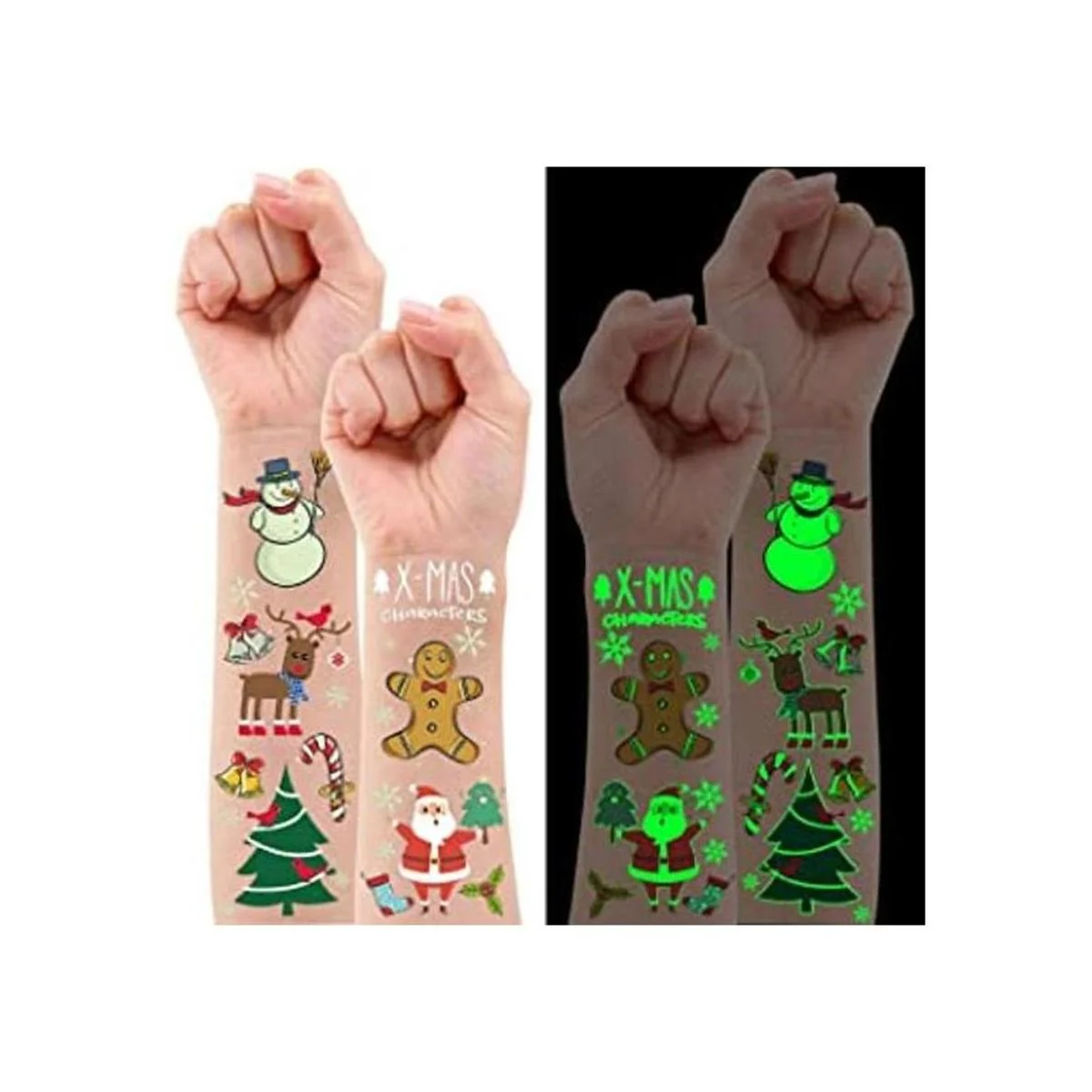 Decoraciones luminosas para fiestas de Navidad para niños: estos son tatuajes temporales luminosos con temática navideña para niños, utilizando nuestros tatuajes para hacerte brillar por la noche y especial en la fiesta. Nuestros tatuajes súper divertidos contienen varios patrones de brillo como muñeco de nieve, Papá Noel, reno árbol de Navidad y otros patrones relacionados con la Navidad. Los niños se enamorarán de la Navidad