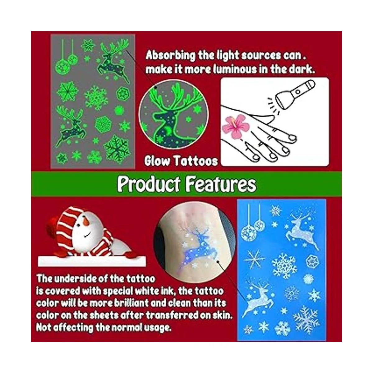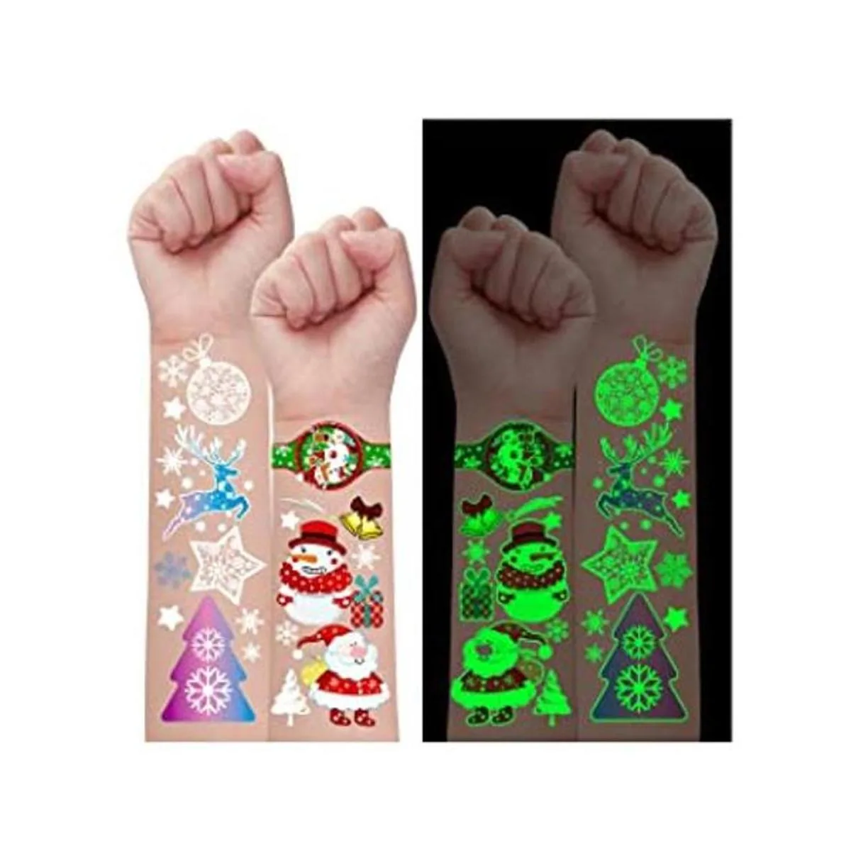 Tatuajes temporales luminosos para fiesta de Navidad: tatuajes temporales luminosos de Navidad para niños y adultos. Incluso en una fiesta con mucha gente, estos tatuajes brillantes te harán único entre la multitud. Incluye elementos muy divertidos como copos de nieve, Papá Noel, muñeco de nieve, calcetines, campana y otros patrones relacionados con la Navidad
