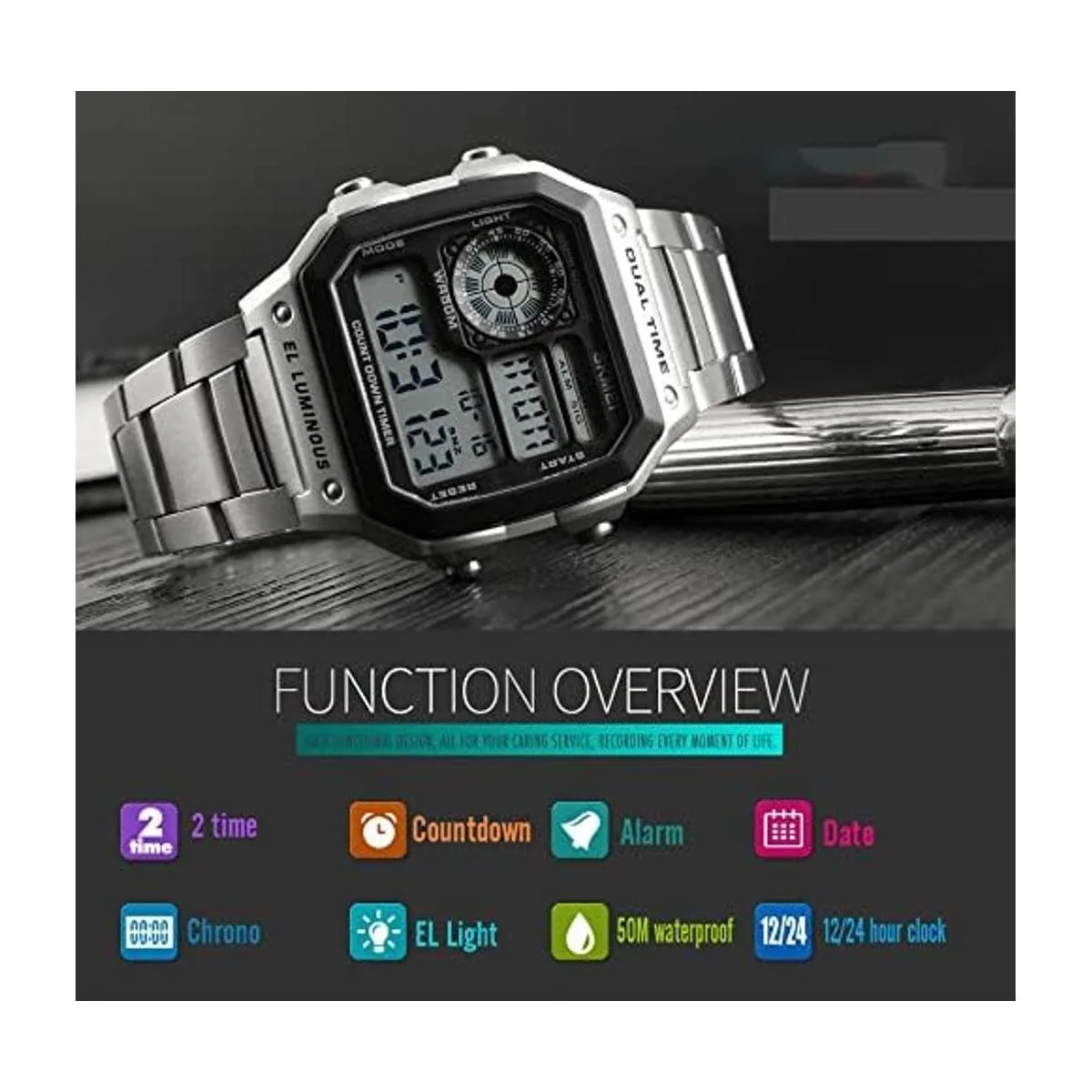 Resistente al agua hasta 164.0 ft: lavar a mano, nadar, sin problema. Perfecto para todo tipo de negocios, casual, actividades en interiores o uso diario. Nota: no presiones el botón en el agua ni uses este reloj para actividades submarinas prolongadas