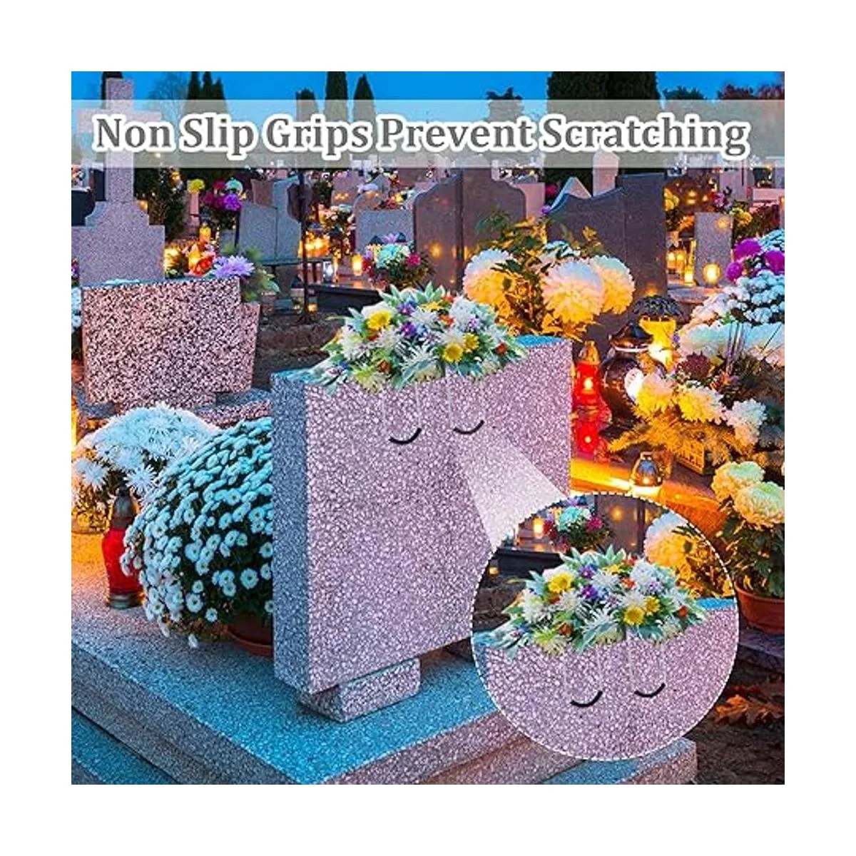 Uso con confianza: el sillín de flores de lápida está hecho de material de metal, resistente y fiable, se puede doblar correctamente para adaptarse a la mayoría de lápidas; con goma envuelta alrededor de ambos lados, no se desliza ni se cae fácilmente, y no raya la superficie de la lápida