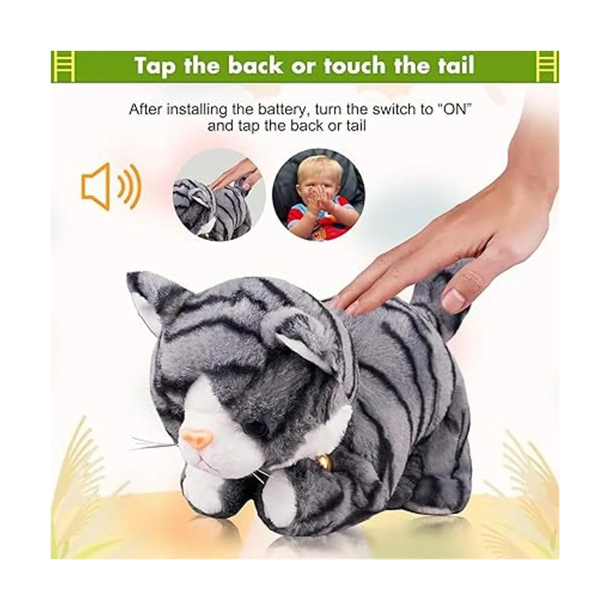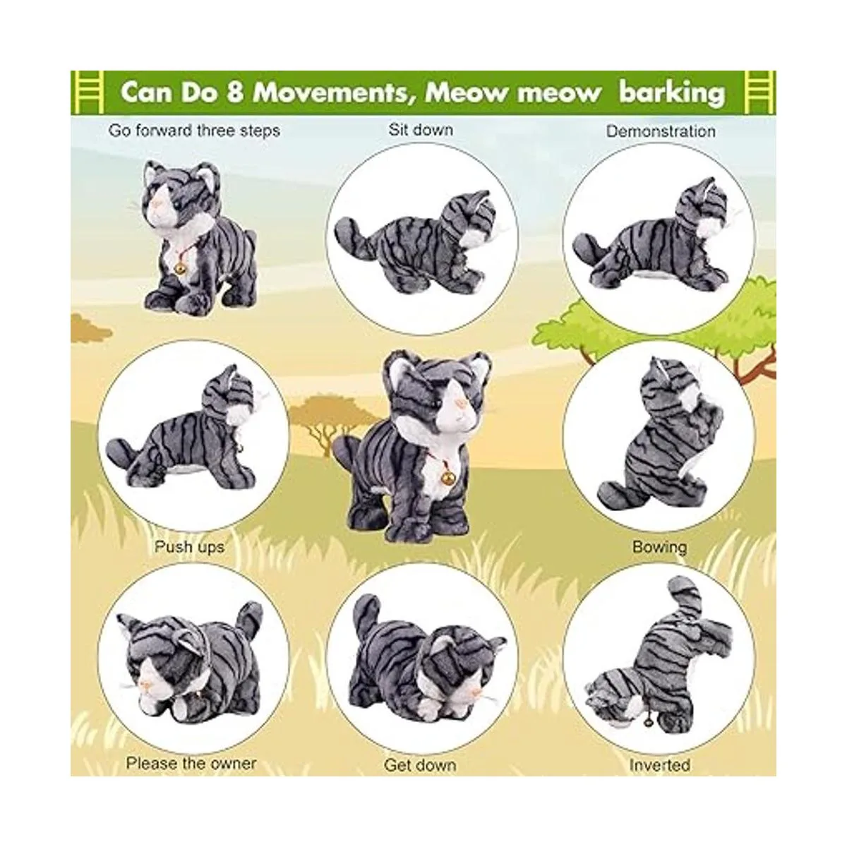 Tela de alta calidad: el gato de juguete está hecho de tela de felpa corta de alta calidad, con una mano de obra de última generación que te proporciona un tacto suave y cómodo, sin caída de cabello, no tóxico, sin olor, y con un aspecto extremadamente vívido y lindo, acciones inteligentes y divertidas, estás garantizado para el cariño de tu bebé.