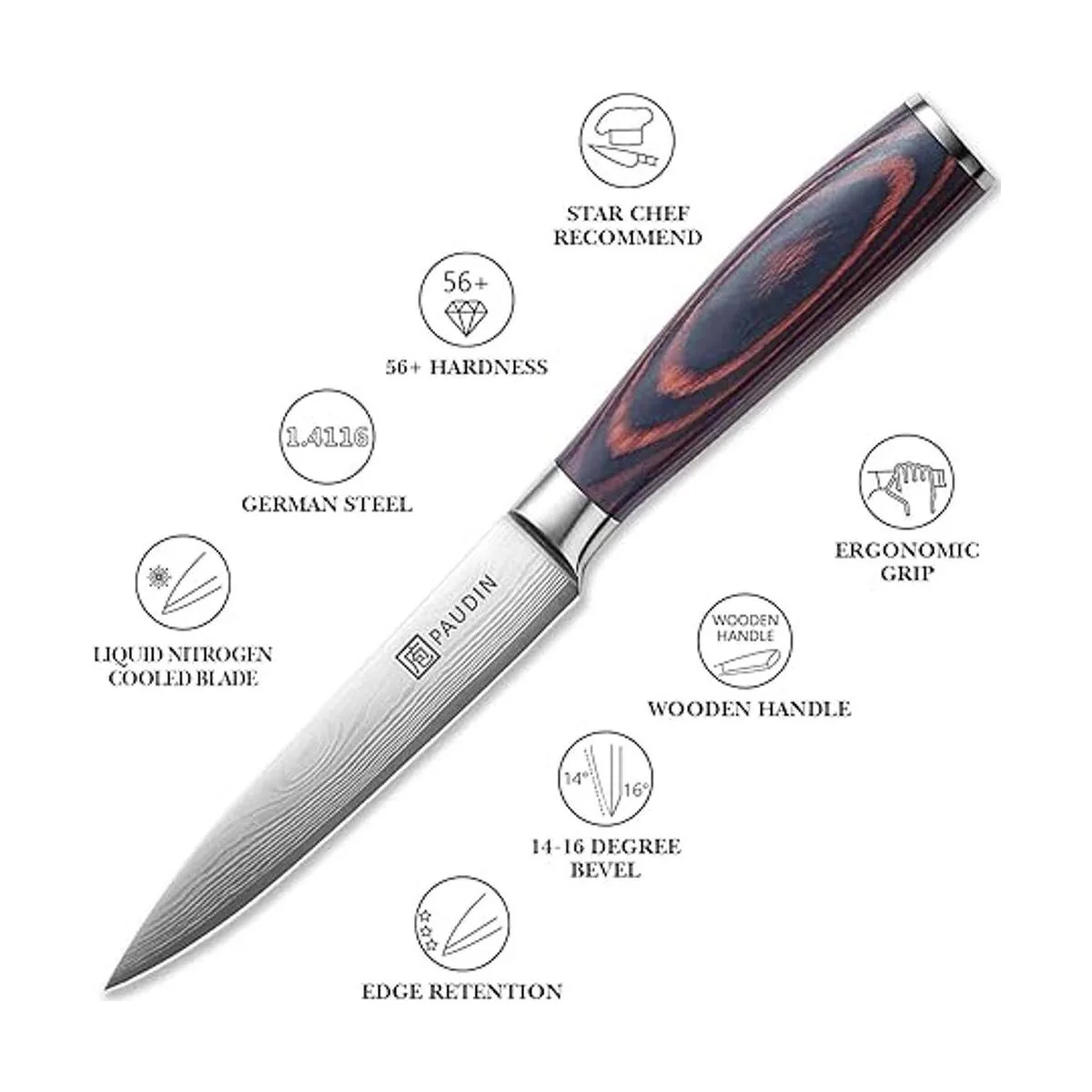Alta calidad: este clásico cuchillo está hecho de acero inoxidable alemán de alta calidad. Y el núcleo de corte alcanza a 56 dureza Rockwell. Y la hoja afilada te permitirá cortar tu comida sin esfuerzo durante mucho tiempo, y el cuchillo está finamente afilado para una nitidez duradera.
