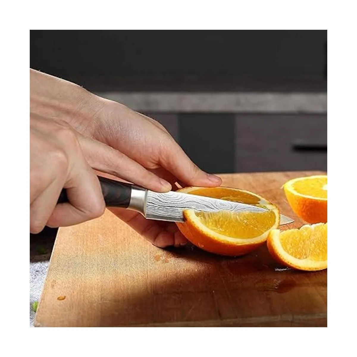Hermoso patrón: la hoja especial con patrón ondulado es especial y sorprendente cuchillos de cocina de acero inoxidable 5Cr15 Mover, no Damasco real. Experimenta un equilibrio y control superiores mientras preparas tu comida, que es tan afilada que corta las verduras y frutas como la mantequilla.