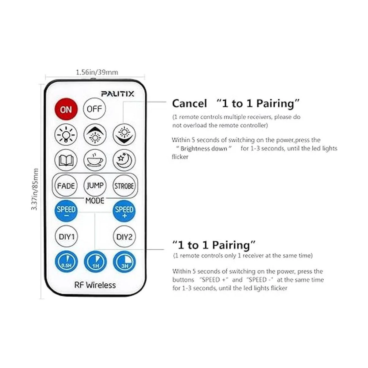 Función de memoria/temporizador: el regulador remoto PAUTIX RF mantendrá la memoria de ajuste de última vez cuando enciendas las luces LED de nuevo. Con la función de temporizador, puedes ajustar la hora 0.5H/1H/3H para retrasar el apagado