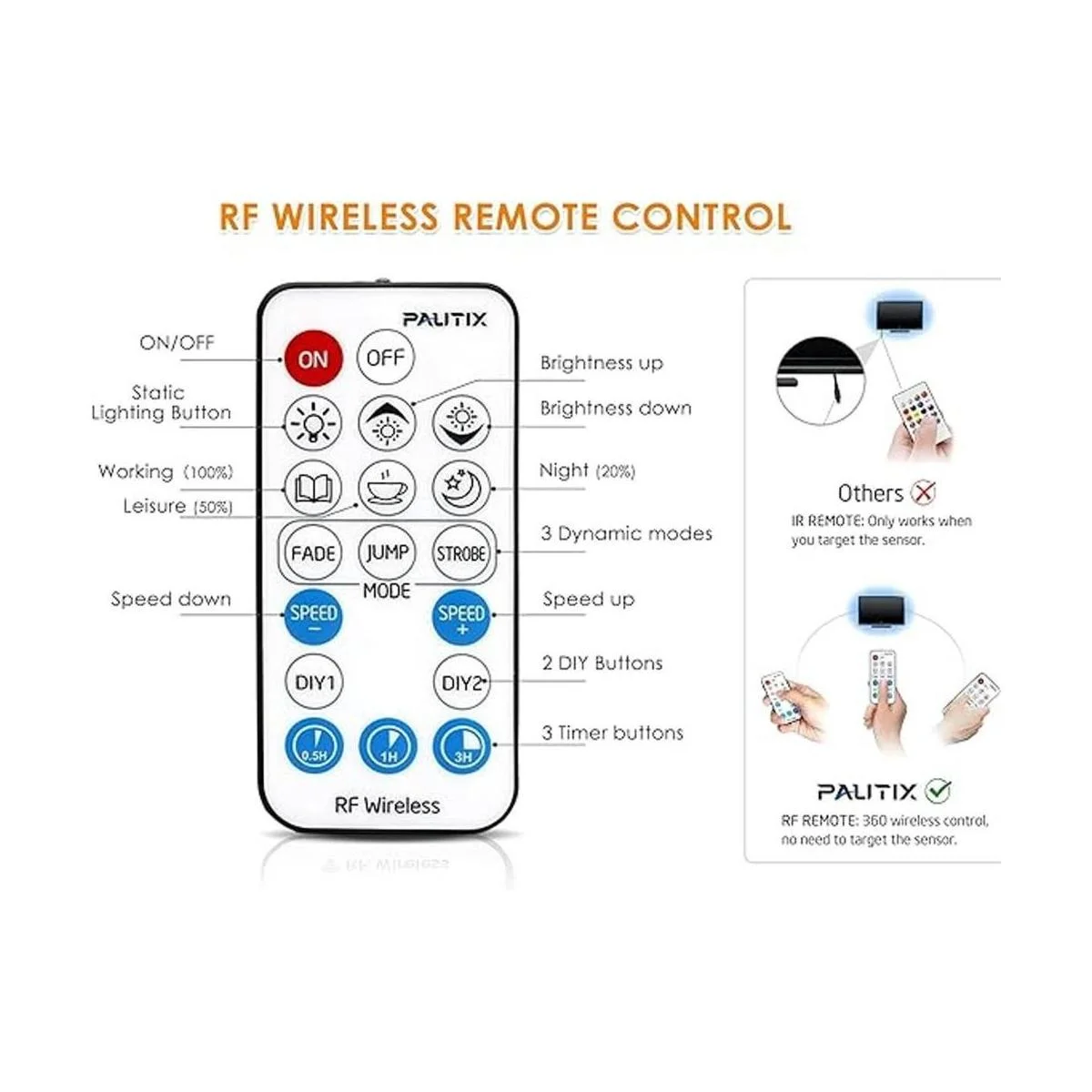 Multidireccional: el control remoto RF es multidireccional, no necesitas apuntar directamente al receptor como el control remoto IR, puedes controlar tu tira LED en cualquier ángulo batería CR2025 de 3 V incluida