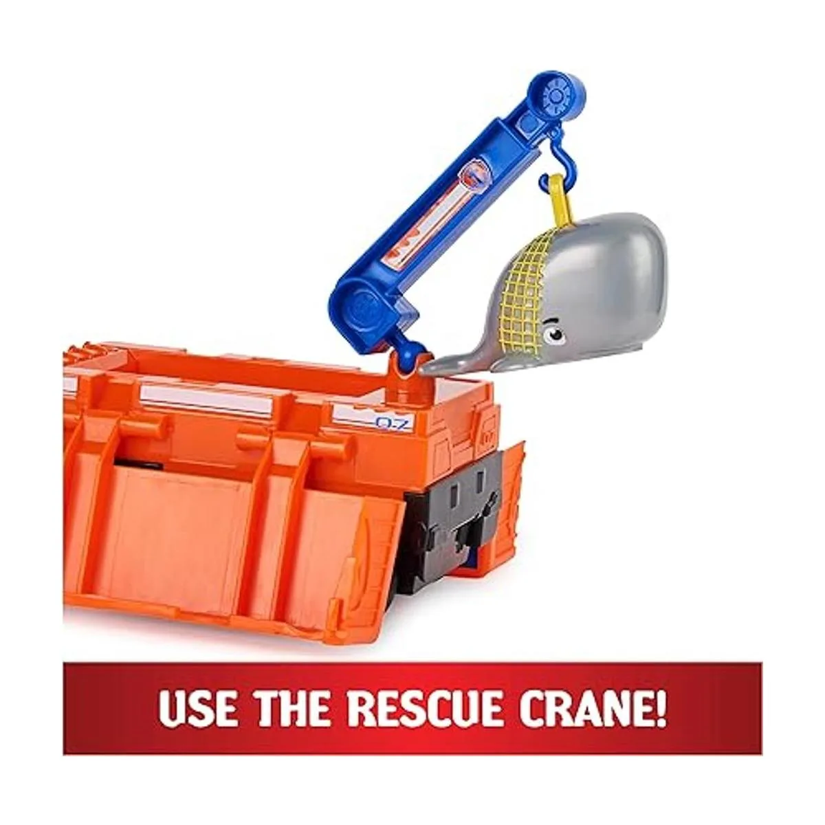 Activa la grúa de rescate cuando el remolque esté en modo Centro de comando, coloca Zuma en los controles para involucrar el juguete de grúa de rescate y carga a su amigo ballena en el tanque de rescate