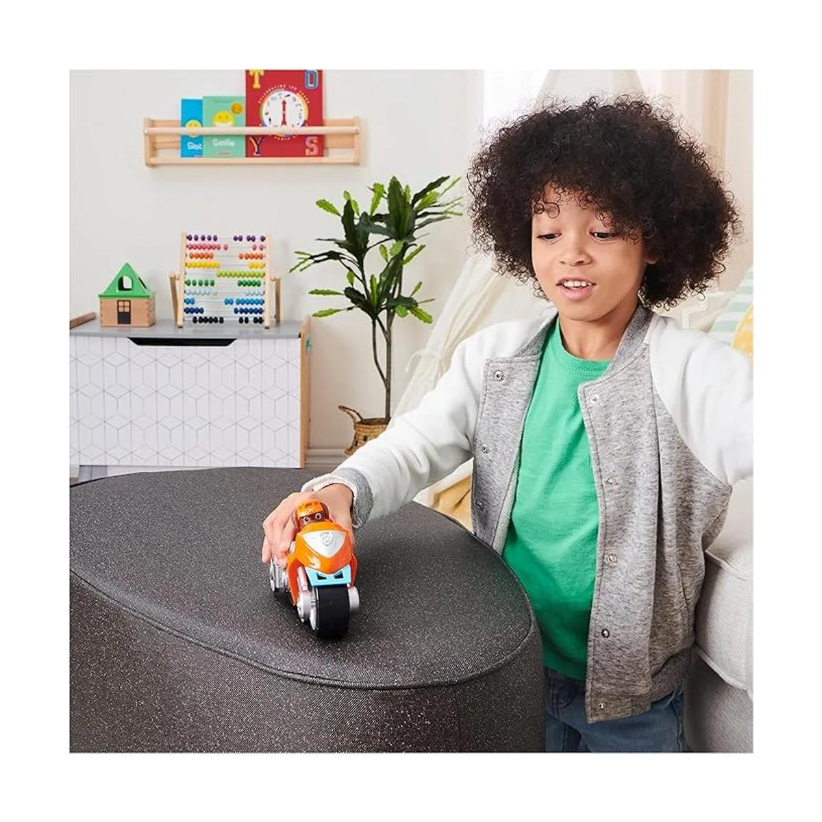 Presiona hacia atrás para que se mueva y haga una pirueta: Levanta las ruedas con el vehículo deluxe de Zuma Presiona la motocicleta hacia atrás y mira cómo avanza el vehículo se mueve hacia adelante, hace una pirueta mientras se acelera al rescate
