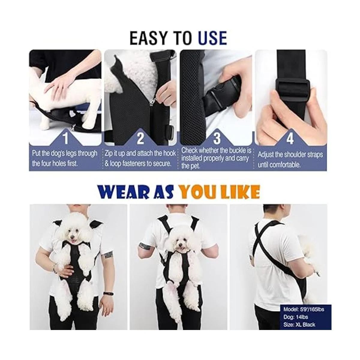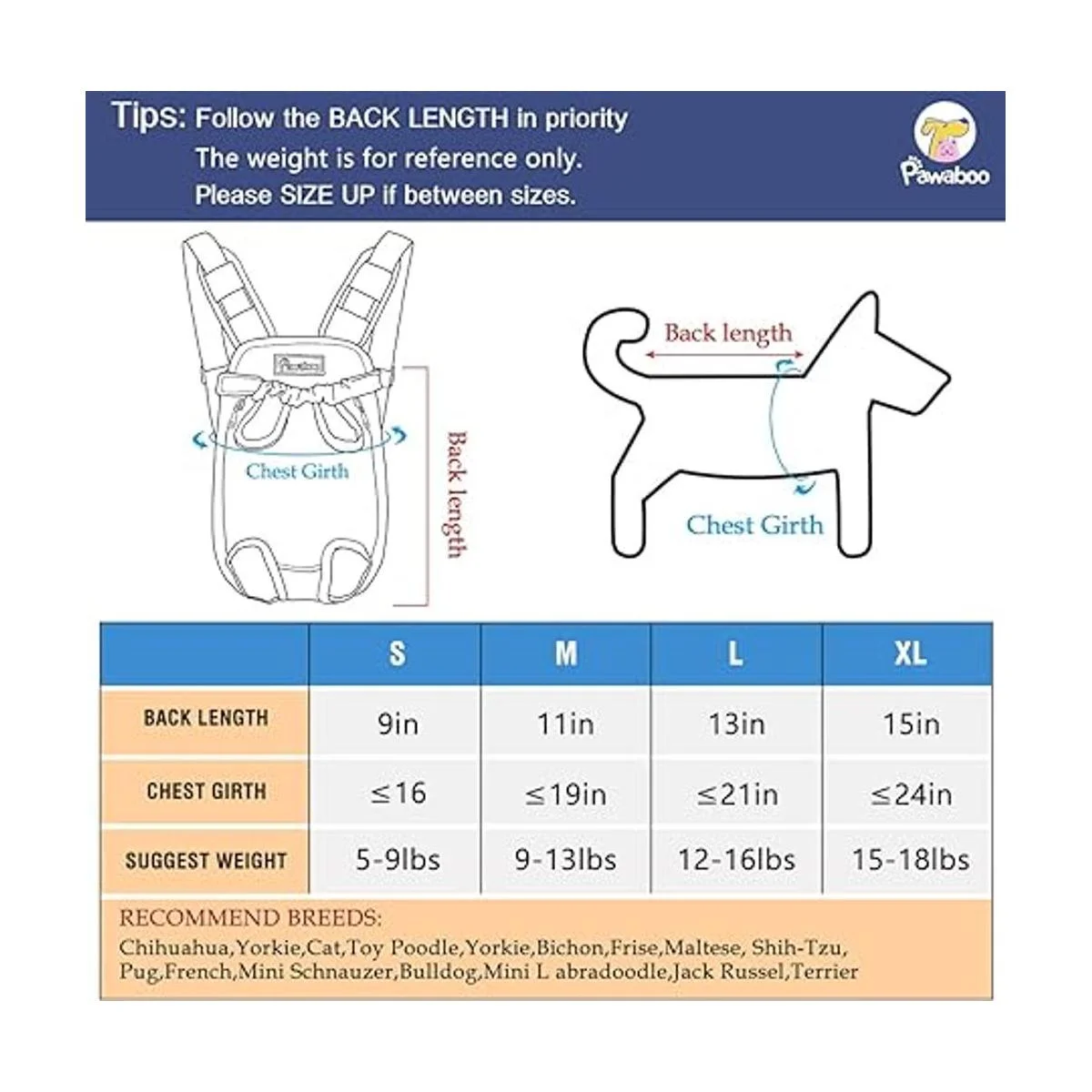 Recomendado para perros y gatos pequeños de menos de 15 libras : La mochila para perros Pawaboo está diseñada para transportar perros y gatos pequeños, lo recomendamos para cachorros que pesen menos de 15 libras un perro más grande puede suponer demasiado peso para el propietario. Mide a tus mascotas y elige según la tabla de tallas imagen 2.